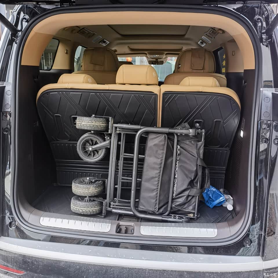 上周末我们一家五口去露营,车子第二排有腿托,老爷子坐上去很舒服,过来一小会就睡着了。后备箱空间很大,能装的下很多露营设备,还能放个几箱矿泉水。中控台下面有个巧妙的设计,可以放东西,老婆的GUCCI包终于不用放在后排地上了。车门上的储物格也装满了零食和饮料,孩子们路上不会饿着。