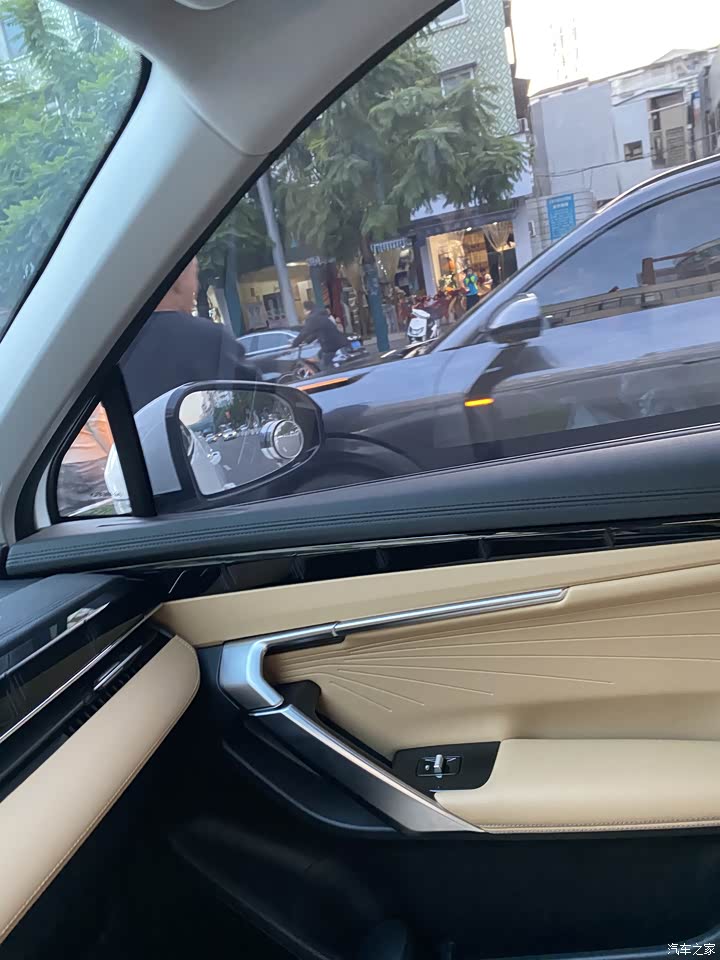 看过了黑色内饰,就觉得这种杏色的内饰非常耐看,没那么压抑,给人一种轻松的感觉,唯一缺点就是不耐脏,中控科技感十足,这么大的屏幕还可以看直播看电视真的非常友好