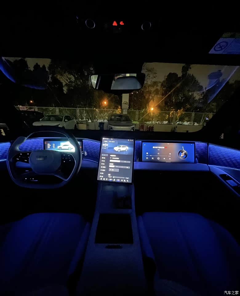 256 色,科技感拉满,很有赛博朋克风格。晚上开车打开氛围灯,车内氛围瞬间就起来了,听着歌、哼着曲,很是自在