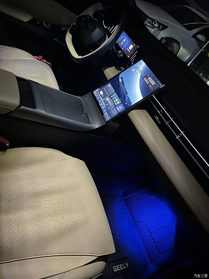 内饰很时尚,浅色的风格和她的外形搭配得恰到好处,顶部和中控也有流行的氛围灯,可以随音乐闪动