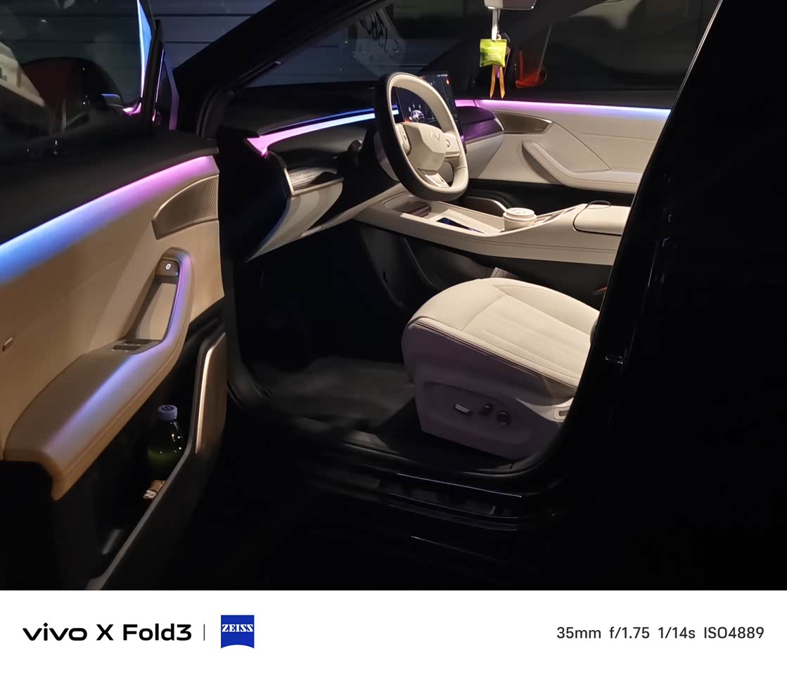内饰我选的是白内 因为通过这个折射的氛围灯 打在白色的饰板上格外的好看 氛围灯的主题也非常多 还可以做很多的自定义 可玩性也很高 我个人是很喜欢简约的内饰的