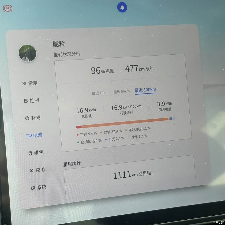 满电显示496km续航,城市大概是400以上,高速巡航100-120时速300多续航,目前驾驶1111km(百分之70高速)充了213度电。