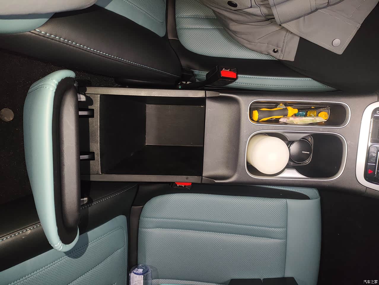 中控台下面也有很大的空间,平时可以放包包。中控扶手箱深度很深,自己加了一个隔板,可以当两层储物空间。