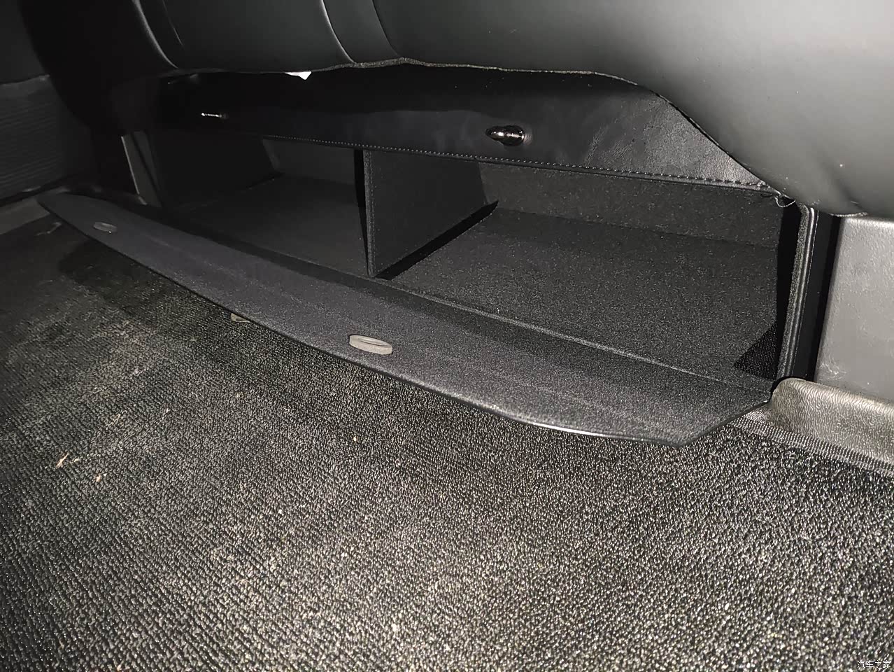 副驾驶手套箱不是传统的形式,做成了抽屉式,实用性更高。后排座椅下方也有一个储物空间,平时不怎么用东西可以放里面,厂家还配送了一个储物箱。