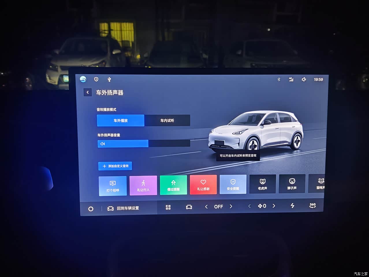 低速行驶警告有3种音效,不能彻底关闭,只能每次上车的时候关闭。有个比较好玩的就是可以向车外播放音频,音频内容可以自定义。