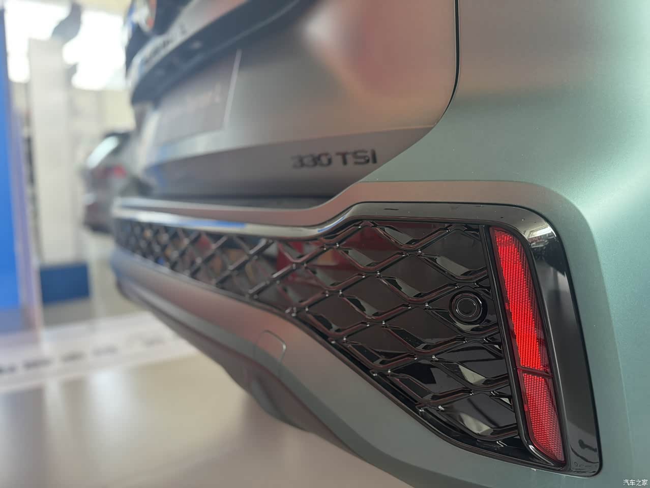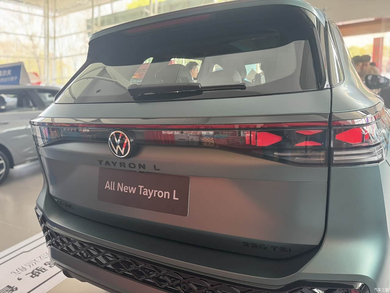 全新探岳L前脸也是有了变化,现在的贯穿式灯光,加上LED日行灯连接了整个前脸,搭配发光的大众LOGO,看上去还是比较大气的,LED矩阵式大灯组支持自适应远近光灯,自动头灯转向辅助灯等功能,前脸上还增加了一个R标,就是这个标的地方显得很随意,然后大面积网格造型的格栅、外后视镜、车顶行李架、轮毂这些地方都进行了熏黑处理,看上去运动感是很明显的,总体上感觉大气了。 车身侧面也很饱满线条流畅,也是车身同色的样子,还配了熏黑的行李架,标配了19寸的熏黑大轮毂。 尾部也是贯穿式尾灯,加上可点亮的大众LOGO,尾灯的样式比较有新意,灯的图案也比较特别,点亮后也是与众不同,后包围与车头呼应,下面也是蜂窝状的造型与前脸相对称,看上去蛮精致的。