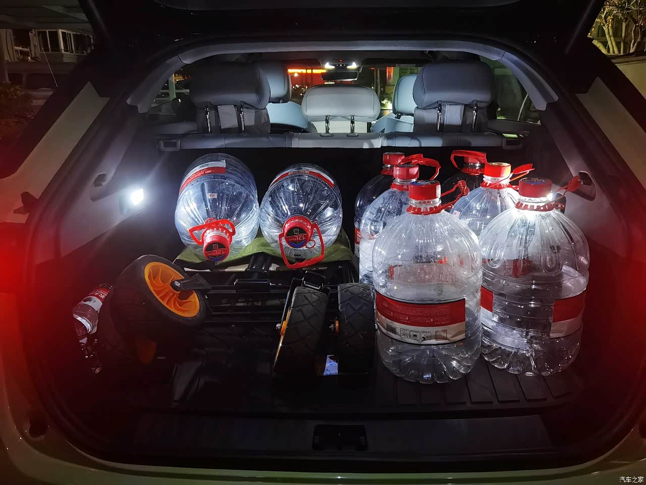 岚图知音空间设计的比较合理,得房率86.7%,让我们的搬家式出行也毫无压力。后排腿部空间969mm(膝盖离前排座椅大概还有三个拳头的距离),翘个二郎腿很轻松,后备箱常规容积527L,放倒座椅直接拓展到1400L。后备箱装下8桶12L的矿泉水,空间还绰绰有余。后排座椅靠背角度可调这个不错,就是后排座椅没有通风、加热和按摩功能有点遗憾,加上仿麂皮顶棚和母婴级环保材料,坐进去既有“豪宅感”又健康安心。央视认证的“健康车”称号,可不是随便发的!