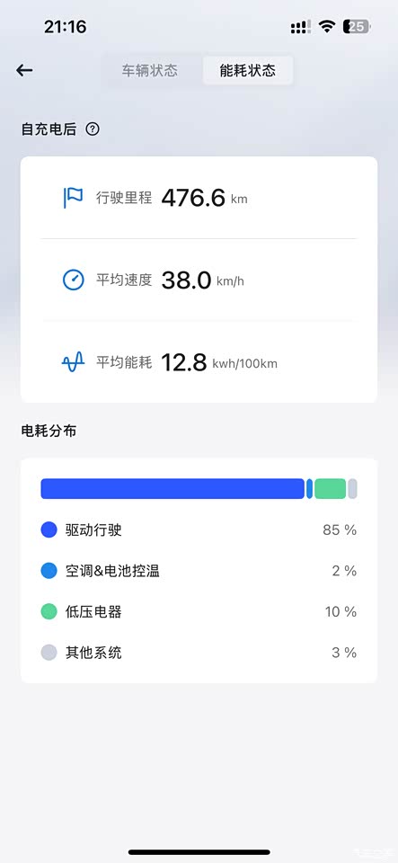 提车当天,就开了90公里高速+城市道路,全程空调,我是九月中旬提的车,气温二十多度,用掉大概13%的电量,能耗还是比较满意的;在九月份第一次跑长途400公里,有340公里高速,电量从90%掉到29%,用了大概61%的电量; 最近气温比较低,能耗就上去了,跑高速最高电耗在18.2kwh/km左右,我一般跑高速比较多,冬季苏州安徽温度-2-10度左右,跑450公里大概需要75%-80%的电量,后面有我跑的数据截图。