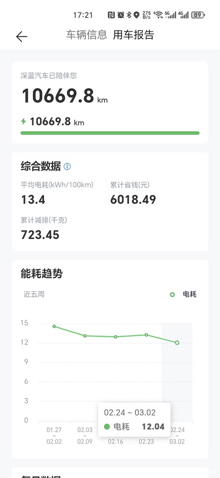 电耗还算可以,平均 13.5 左右,不过冬天基本没开空调,只开了座椅加热!买车以来一直慢充,冬天实际都能跑 400 公里以上,天气好点可以达到 500 公里!