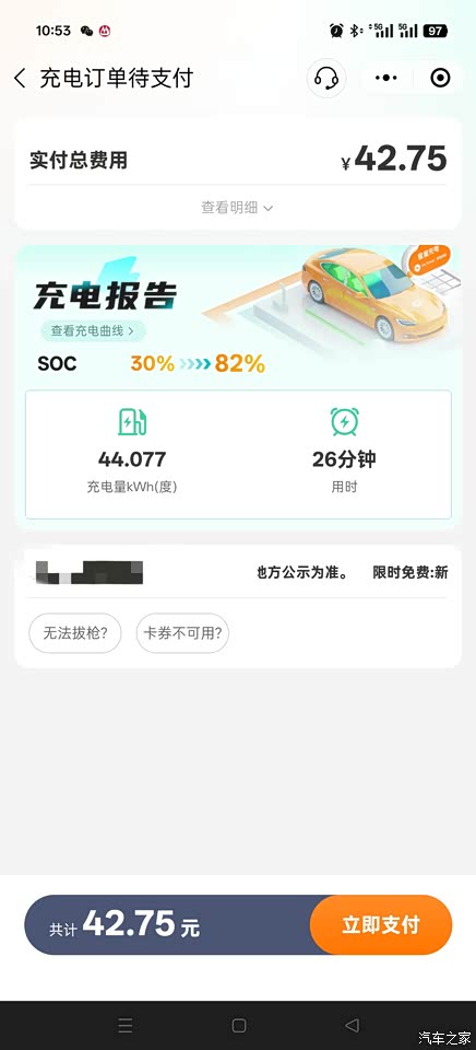 目前的用车主要是城市短途代步,偶尔周边出游,基本也是在100公里范围内,所以520公里的纯电续航也是完全够用了。跑了几次高速总结了一下表显续航和实际续航差距不会很大,续航达成率可以给90%吧。同时还测试了一下快充速度,附近随便找了一个快充站试了一下,30%到82%只用了26分钟。虽然没有完全达到3C的充电速度,不过也可以接受了。