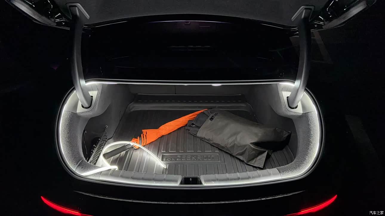 空间方面装载能力还是不错的,我后备箱里放了一个后备箱垫,防水耐磨,防止原车的绒面层损坏。同时放了一把极氪雨伞,在下雨天可供使用。下层空间放了许多小物品,让我觉得最有用、使用频率最高的是插线板、充气泵和放电插座。 自己加装了后备箱灯带 很好看 白天的时候不是特别明显,在晚上打开后备箱眼前一亮,同时灯带带来的灯光方便寻找东西,很棒,看上去也高级感满满。