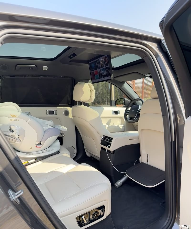 内饰:车内用料考究,我选择了白内,白内是真的耐看,但是不太好清理不耐脏,大面积软包与Nappa真皮搭配,前排中控两块大屏很有感觉,整车也非常豪华,后排有块独立屏幕,还有后排脚踏,感觉跟商务车没太大的区别,配置真的拉满了!