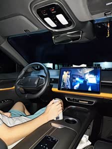 内饰方面: 内饰是极简主义,选择不管什么颜色的内饰都很耐看,而且标配副驾零重力座椅,一键放倒如选配前排双零重力座椅还加副驾娱乐屏,放松娱乐两不误。音响是14个,个人很喜欢尤其是听重低音的电音或流行乐非常有氛围感。个人也很喜欢中控的向日葵屏幕,可以左右调节,主驾看导航,副驾看视频都非常方便,配上巨大的天幕逼格满满。