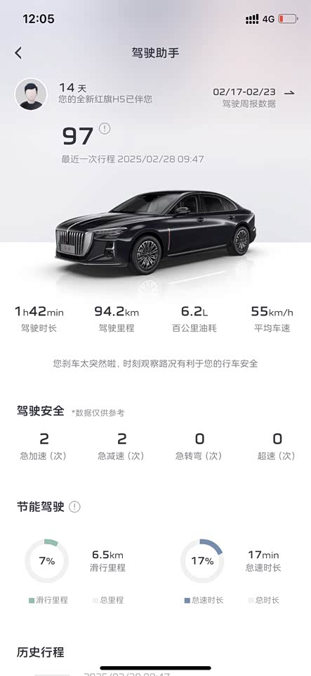 红旗H5的油耗是偏高的,相对于混动车来讲,日常的费用也是比较高。但是对于我而言,已经提了一款车长5米的B级轿车,那么油耗高是我所能接受的。对于我来说,平常开市区大概10~12个油,跑了两次高速在100km左右,综合油耗在6~6.5之间。车机系统有延迟,并且没有配备carplay,在使用过程中不太方便,需要用手机导航,黑车还有些爱脏,需要经常洗车。