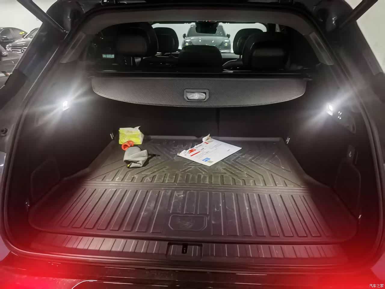 7x得益于传统造型的缘故,头顶空间非常棒,即使在加了顶部遮阳帘的情况下187的身高头部距离车顶也有一拳距离。 纵向空间因为前备箱的原因也是主流水准,只要不是前后都是180 的大高个,后排跷二郎腿没有问题。如果7x能把前备箱节省的空间移给乘员舱,后排空间完美,同时NVH也会变好。 7x的储物空间设计的比较有细节,手套箱可加锁,解决了车里不敢放贵重物品的烦恼。 中央扶手箱不选装冰箱的情况下,8L的容积足够使用了。