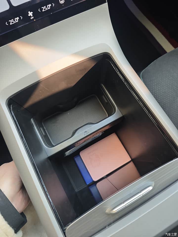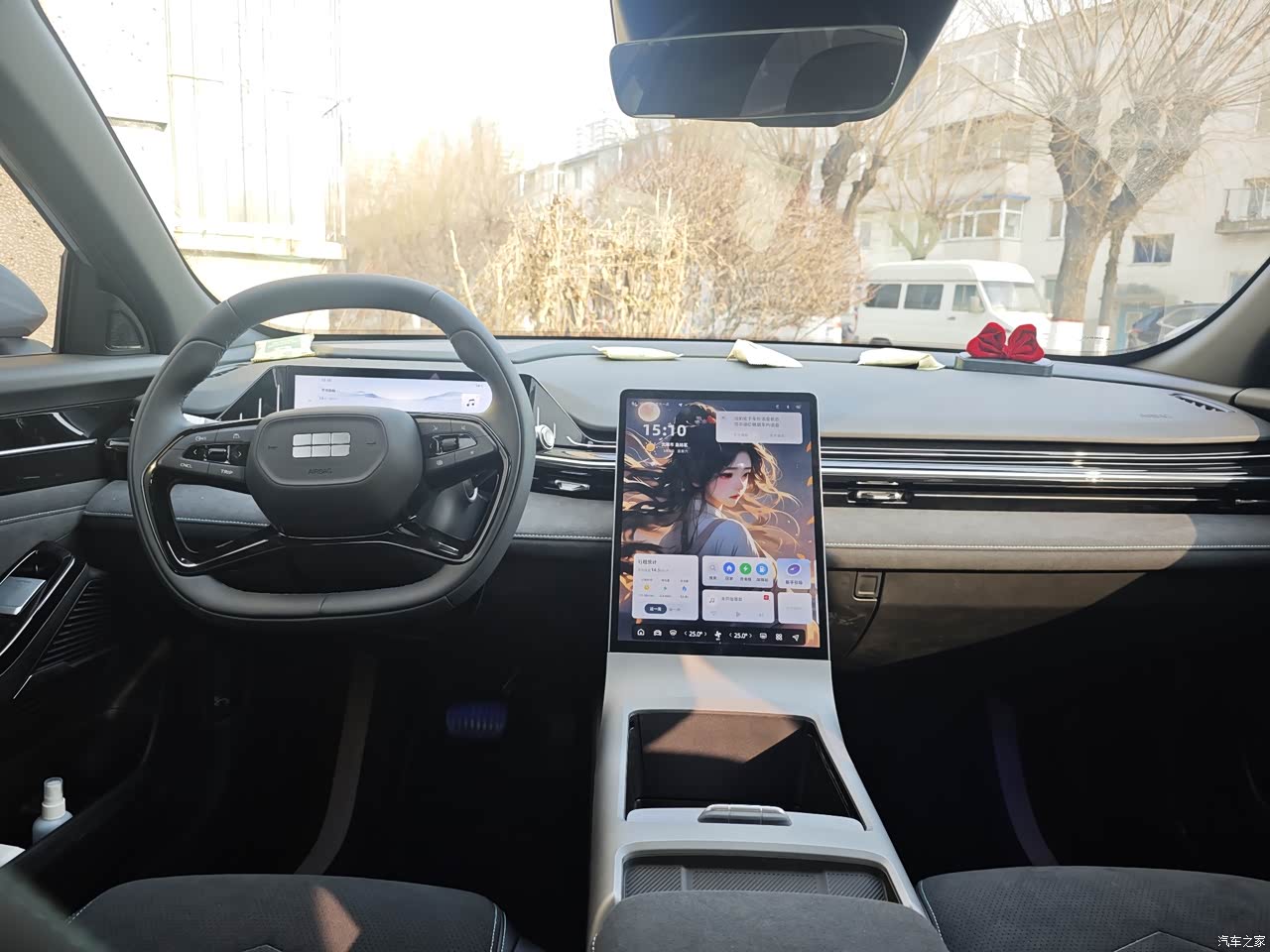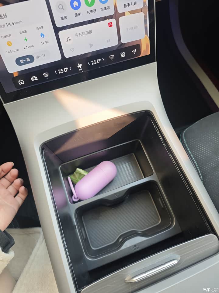 内饰灯带会伴随音乐变化,时尚感科技感十足。中控室是竖屏的,看着有些不太舒服,习惯了之后还好,马马虎虎吧。不喜欢的是手机无线充电的位置,感觉拿取手机很别扭。
