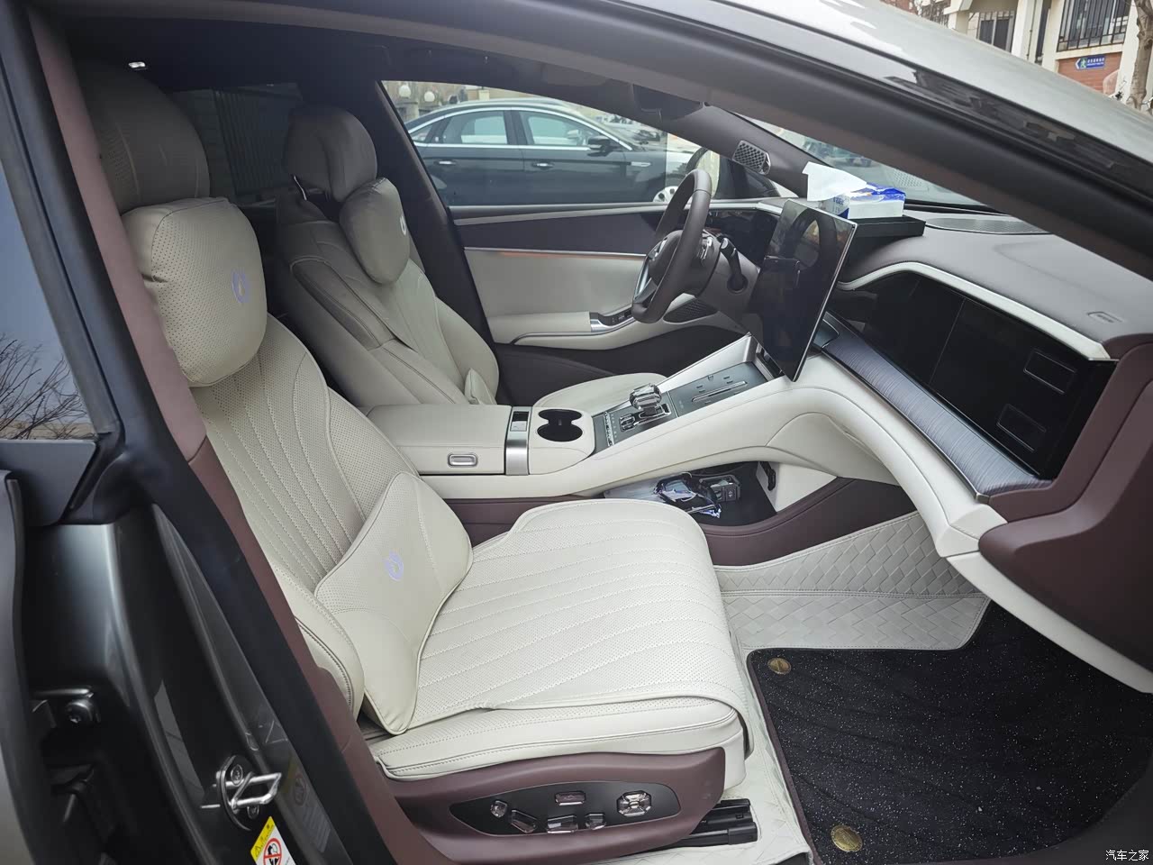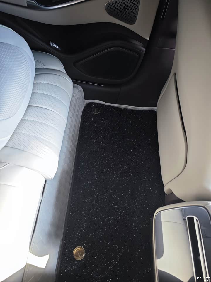 内饰方面,车内几乎全真皮包裹,门板储物格底部也用软皮覆盖,手感极佳。前排座椅通风/加热/按摩、副驾零重力座椅、四区空调、前排冷暖冰箱等配置,直接对标百万豪车。但中控台设计略显老气,车内储物空间略少,音响罩反光问题需优化。 四个座椅都有座椅加热,座椅通风,座椅按摩,配置真的拉满,还有就是白色内饰容易脏,尤其是要尽量避免穿牛仔裤坐车。😂
