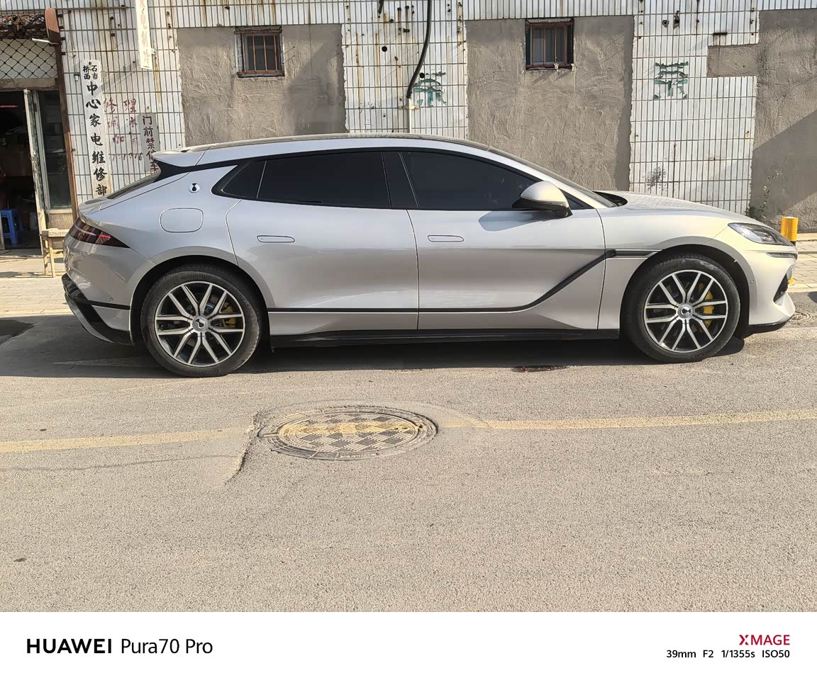 要说外观这车真的是打遍天下无敌手,太好看了。我就是一个纯粹的颜狗,之前感兴趣的小米Su7、阿维塔12、智界S7也都是因为认可这些车的颜值,至少觉得不丑才会有去试驾的想法,但腾势Z9GT真的是那种一眼看过去就不可能觉得丑的好看。记得当时第一次在网上看到路试车的视频,觉得真是惊艳到现在,那个时候大家的评论都是"感觉是超级英雄里最大的反派开的车"。流线型车身设计,兼具优雅与运动感,符合GT车型的定位。其前脸设计大气,车身线条流畅,尾部造型饱满,整体视觉效果非惊艳。不管是纯黑的黑武士,还是我最终选择的月华银,都有独特的魅力在。特别是月华银车漆,在不同光照条件下,会反射出不同的颜色,在太阳光下金光闪闪,十分大气。