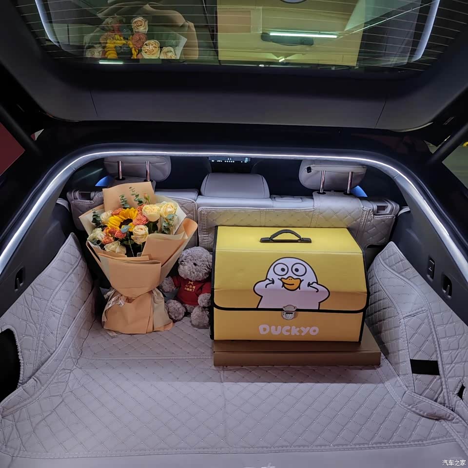 瀑布式的氛围灯随着音乐闪动,氛围感拉满。坐在车里很温馨,不压抑,真皮座椅坐着太舒服了,朋友体验后排也连连称赞。