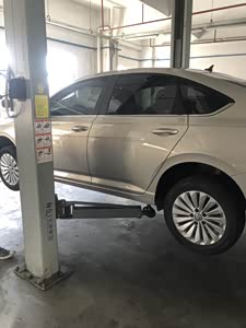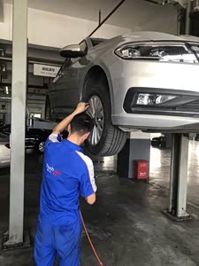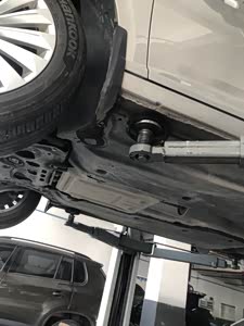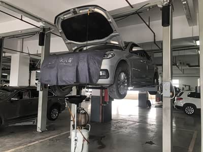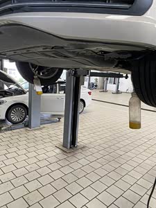车辆在行驶过一段时间之后就可以到店检测一下底盘的状况。这样子可以更好的了解车子。刚好前段时间呢APP发了一个车辆免费检测的券,可以给车子做一个全面的检测,然后我就把车子开到了店里。跟售后说了这个检测一下车子。售后就开了一个单子,然后师傅就把车子开到车间里面,用直升机举起来,注意这里。是举升机放置的位置千万不要放错了,不然会把车子给弄坏的,然后再查看底盘的状况。看看有没有刮蹭的,查看完底盘之后呢,我们再来补充一下胎压,补充胎压之前可以先清除一下轮胎里面的石子,卡了现在是夏天,胎压打的可以稍微低一点儿,2.3左右就可以了。冬天的话可以打高一些,然后再来查看一下机舱的状况,检查一下机油的消耗。最后再用行车电脑检查一下有没有故障码就可以了。