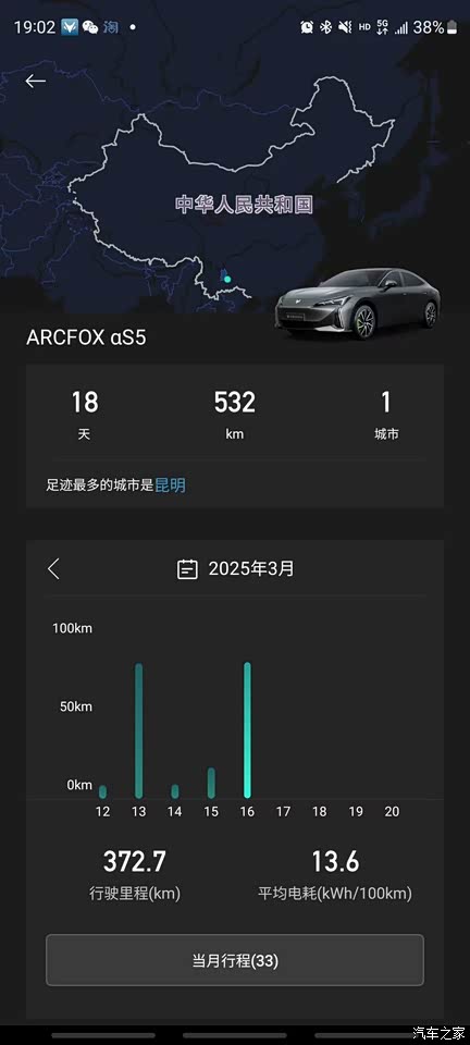原来开迈锐宝,市区油耗14个。实在受不了了才换的电车。3月份昆明春天天气不错,平均电耗13.6,和官方数据一致,巧不巧,惊不惊喜意不意外!里程城郊市区一半的一半。好像时速80的时候最省电。人就是贱,有家冲,谷电价3毛多点,但是每天还是盯着电耗看,不知道是什么心理。还没跑过长途,不知道极限续航是多少。旅程焦虑还是有一点。不差钱就上706,560还是差着点。