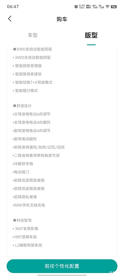 全车双层夹胶隔音玻璃 降噪防紫外线 50w手机无线充电 副驾女王座椅 L2辅助驾驶 XWD博格华纳六代四驱技术 越野表盘 涉水雷达 360环影 透明底盘 等等 配置够用
