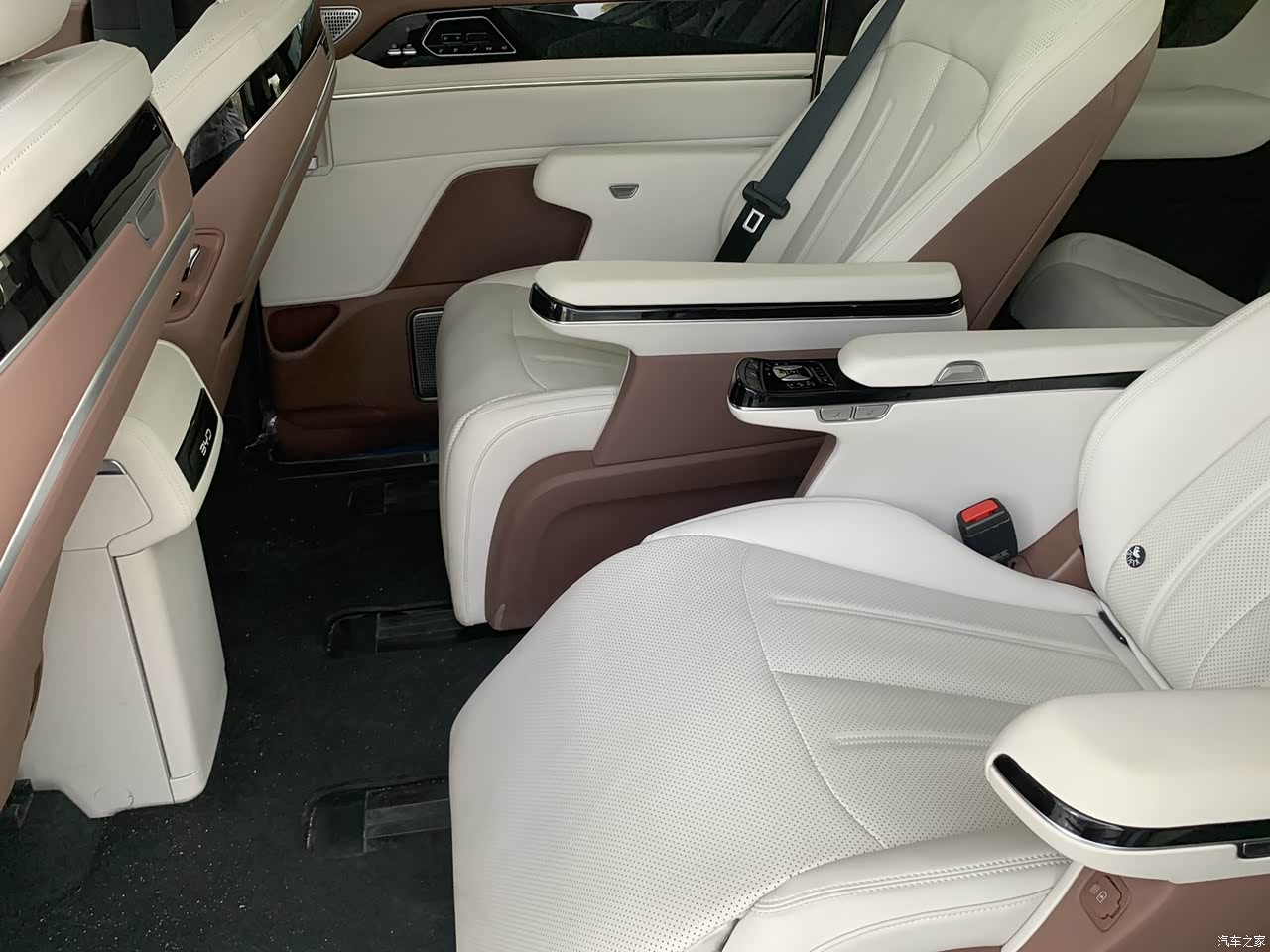 从外观上面就可以知道它的空间是会很大的,他是2+2+3的布局。第二排的航空座椅,是有很多智能功能的,能够按摩、加热、腿托等等都安排上了,第三排的位置高度也还不错,不像别的车弄的很低坐久了会很累。它坐起来,腿伸展还行、会比较舒服。即使是成年人他的腿,离前面的位置都是有1拳多的。虽然后面第三排的位置整体上看上去会窄小,但坐进去不会感到压抑不舒服,这个比别的七座车要舒服多了。坐满七个人的话,后备箱的空间就没有那么大了,只能放下一个24寸的行李箱,如果需要长途出行人又多的话就要加装车顶箱去增加物品的收纳空间。但是如果人少的话是可以将第三排折叠完全成为一个纯平的空间,这样子就只剩下前两排的位置,后面那个空间就变得很大,第二排还有一些小桌板还有吸顶屏的组合,可以在车内看电视,巴适得板。