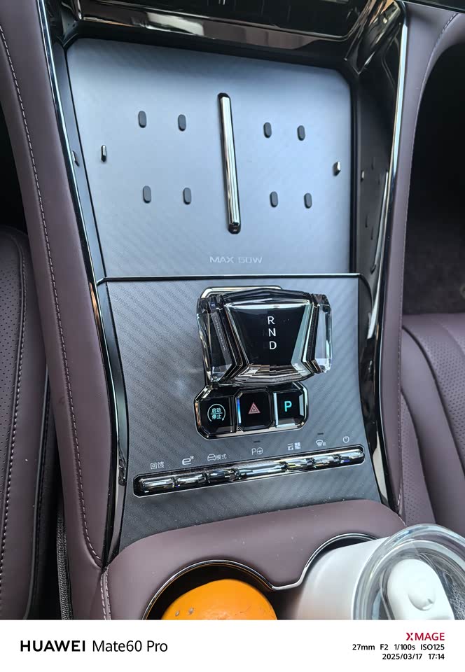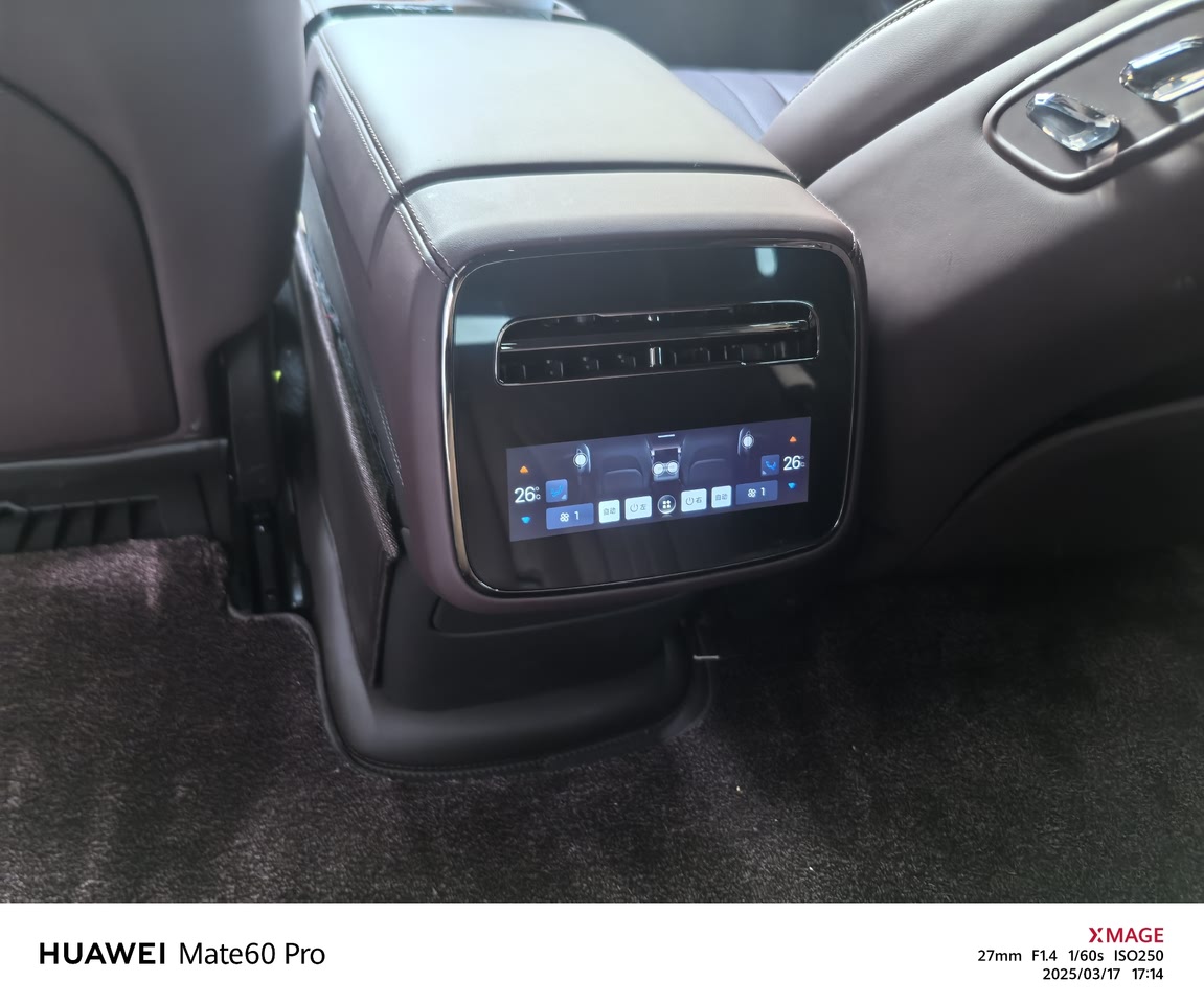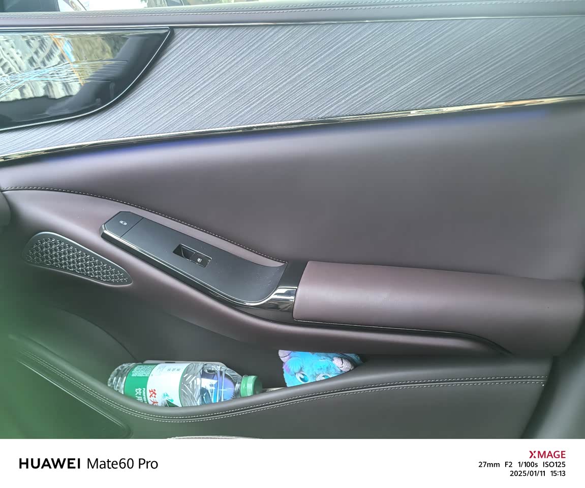 内饰套用老余的话来说就是一个字"尊"双环抱式的座舱设计很高档,豪华的气质迎面扑来,这么一对比我之前的问界确实差很远。 我最喜欢的是真皮和木纹板的部分,二者结合没想到这么和谐。软包的部分都是真皮包覆,摸起来质感非常的好,很舒适,再加上精细线条和一些金属质感饰板的点缀,和128色的氛围灯营造的氛围,确实对得起豪华二字。 音响方面是帝瓦雷升降扬声器,我对这一块没有很高的追求,觉得音响效果还不错,特别是打开QQ音乐是升起来的设计比较喜欢。 车内显示部分规格也很高,50寸的hud平常开起来很方便,再也不用低头看车速多少了。17.3寸的中控屏和13.2寸的副驾娱乐屏科技感拉满。 双50瓦快充无线充电面板,说实话很鸡肋,老是接触不良,还有就是冲一会电手机就会很烫,这一点没有问界做得好。 前后配备的两个冷暖冰箱一个是4升一个是10升,都可以支持35-50度制热,和最低﹣6度制冷。具体效果不知道怎么样,因为还没开启过。平常只用来放水。