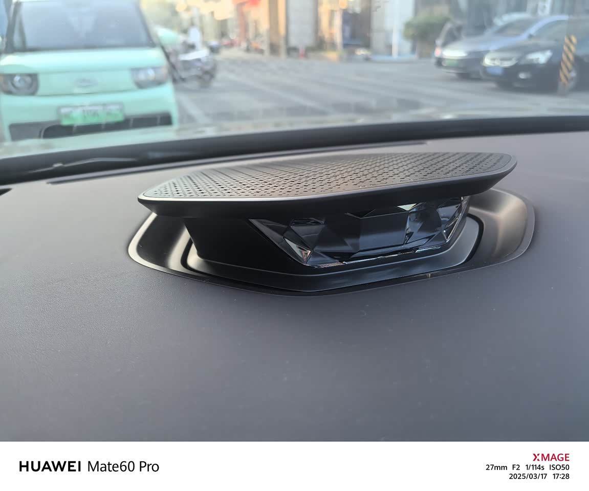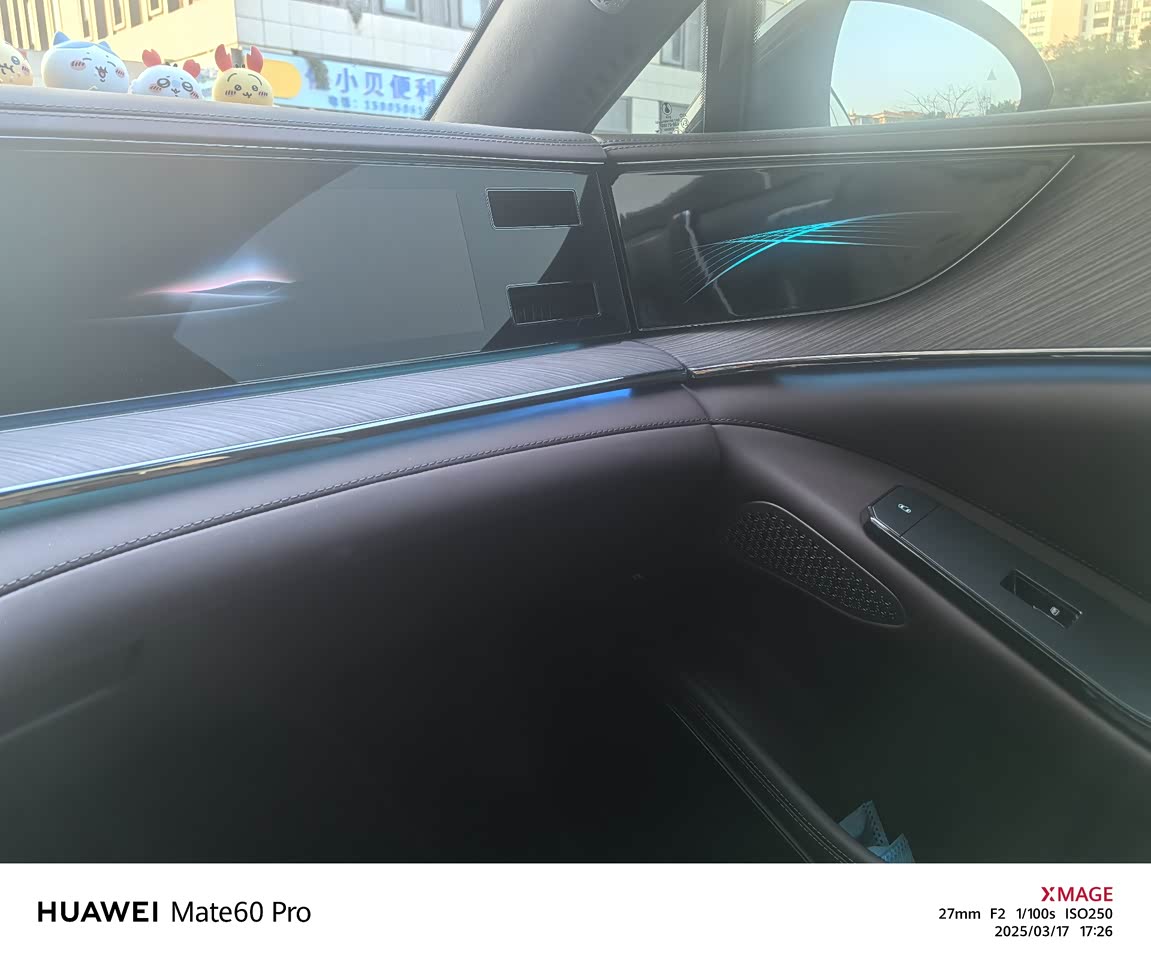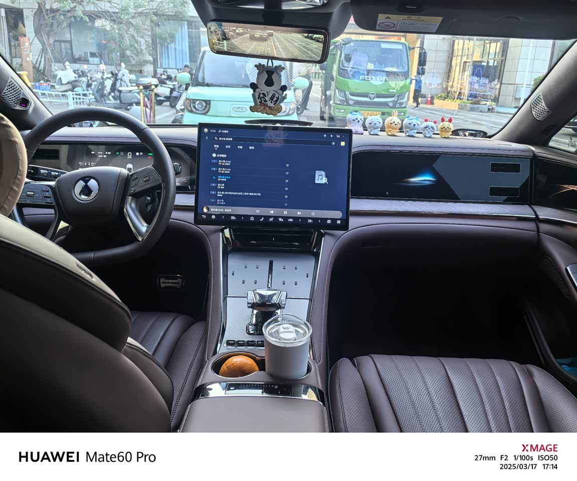 内饰套用老余的话来说就是一个字"尊"双环抱式的座舱设计很高档,豪华的气质迎面扑来,这么一对比我之前的问界确实差很远。 我最喜欢的是真皮和木纹板的部分,二者结合没想到这么和谐。软包的部分都是真皮包覆,摸起来质感非常的好,很舒适,再加上精细线条和一些金属质感饰板的点缀,和128色的氛围灯营造的氛围,确实对得起豪华二字。 音响方面是帝瓦雷升降扬声器,我对这一块没有很高的追求,觉得音响效果还不错,特别是打开QQ音乐是升起来的设计比较喜欢。 车内显示部分规格也很高,50寸的hud平常开起来很方便,再也不用低头看车速多少了。17.3寸的中控屏和13.2寸的副驾娱乐屏科技感拉满。 双50瓦快充无线充电面板,说实话很鸡肋,老是接触不良,还有就是冲一会电手机就会很烫,这一点没有问界做得好。 前后配备的两个冷暖冰箱一个是4升一个是10升,都可以支持35-50度制热,和最低﹣6度制冷。具体效果不知道怎么样,因为还没开启过。平常只用来放水。