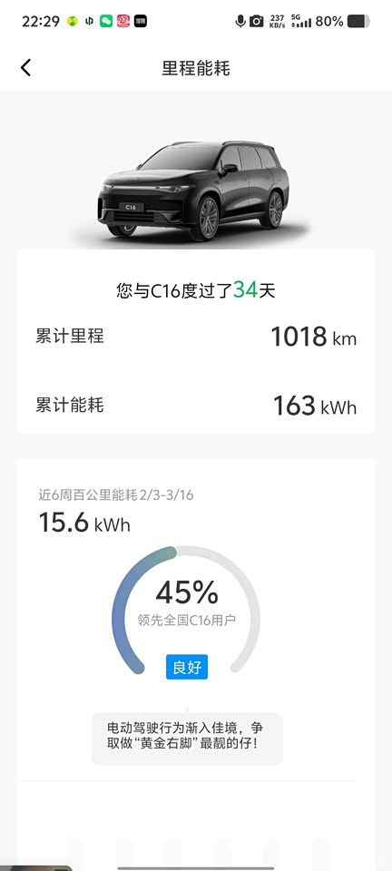 新车不知不觉已经驾驶一个多月,跑了1千公里多一点点啦🥰🥰🥰 提车的喜庆感依旧在,不少朋友看见都讨论一下,也上车体验一把,大家的评价都十分的高,这价格相当的对得起咋们的c16.身边的朋友们对它(c16)的好感直接拉满 刚买回来一周,驾驶还是比较保守,小心翼翼的,所以刚开始第一次电量的消耗还是非常的低哦,整体能打到9折 到了第二周,对车辆熟了之后,那就有点“飘了”,开起来车比较猛,那消耗刷刷的掉,整体就降下来,要打到6.5-7.5折了。 后面就掌握到了精髓了,起步温柔了,刹车也减少,开顺畅一些。 今天一天开车实际41公里,路途中全程开着空调,舒服在40-70之间,最后电量消耗显示是少了49公里数,全程还是开着空调来驾驶,最后折算下来八折多吧,跟官方的数据差不多,还是非常的贴合的。 充电的时候,也是按照软件的推荐,预留的20%多,然后冲到30%左右。刚提车的时候还是听了网友说,充满一次后,然后把电量使用完,后面就按照推荐的使用了,听说后面对电池的保护,几个月把电量消耗完,再充满,也不知道是不是。 平时日常中车辆都是把它当成4座车来使用,2排朋友们坐的都说挺舒服的,后年直接放倒,都是拿来拉东西,那效果,空间妥妥的,直接拉满,非常的好用,