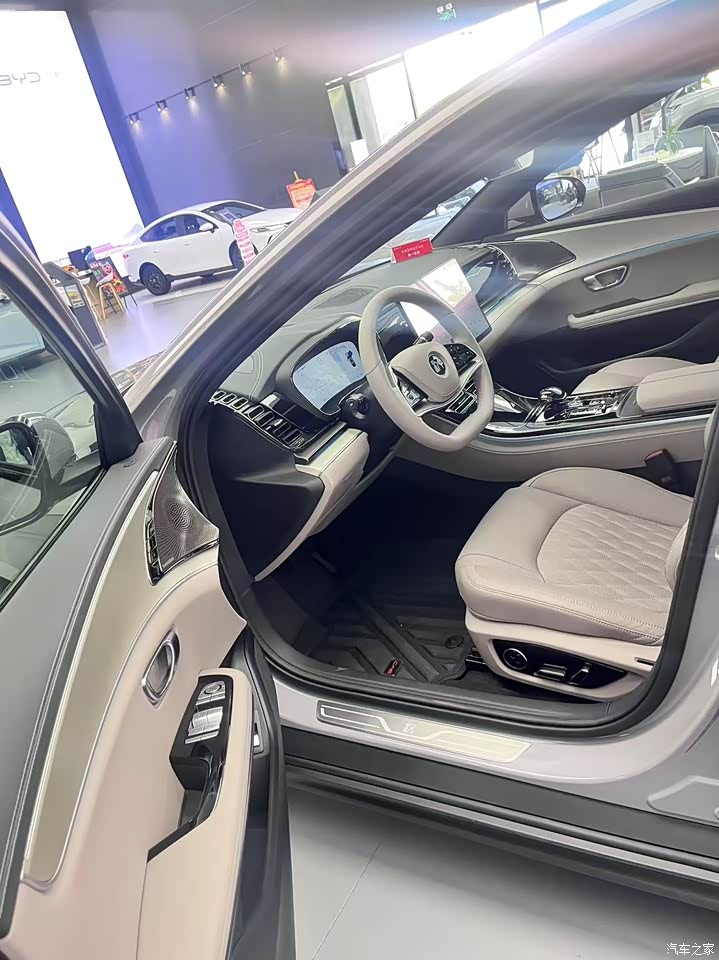 汉DM-i智驾版的内饰同样令人眼前一亮。环抱式座舱设计搭配可旋转的15.6英寸中控大屏和12.3英寸全液晶仪表盘,科技感扑面而来。座椅采用皮质材料包裹,坐感舒适且支撑性良好,长途驾驶也不易感到疲劳。此外,车内还配备了多色氛围灯、丹拿音响等高端配置,进一步提升了驾乘体验的豪华感。