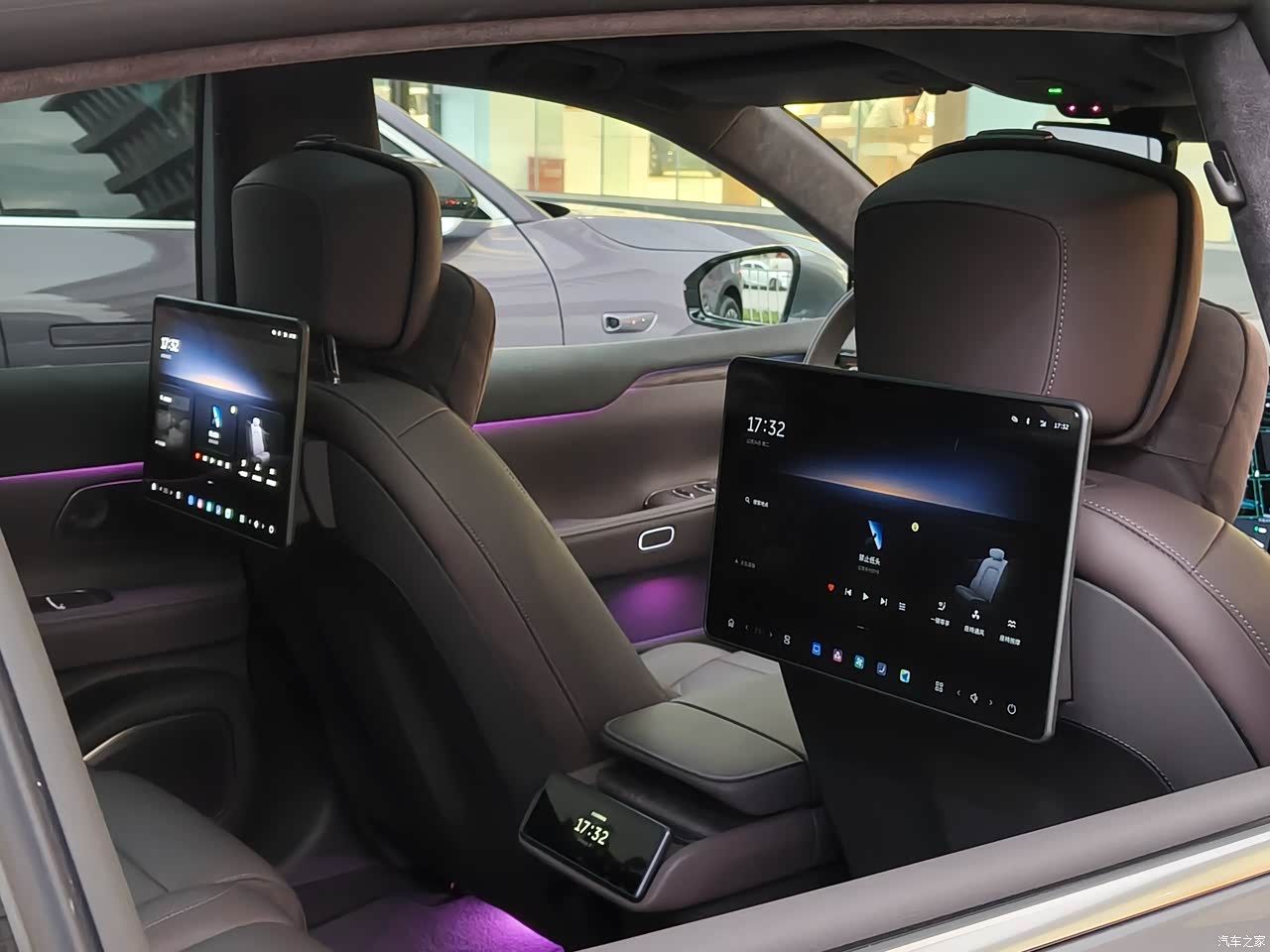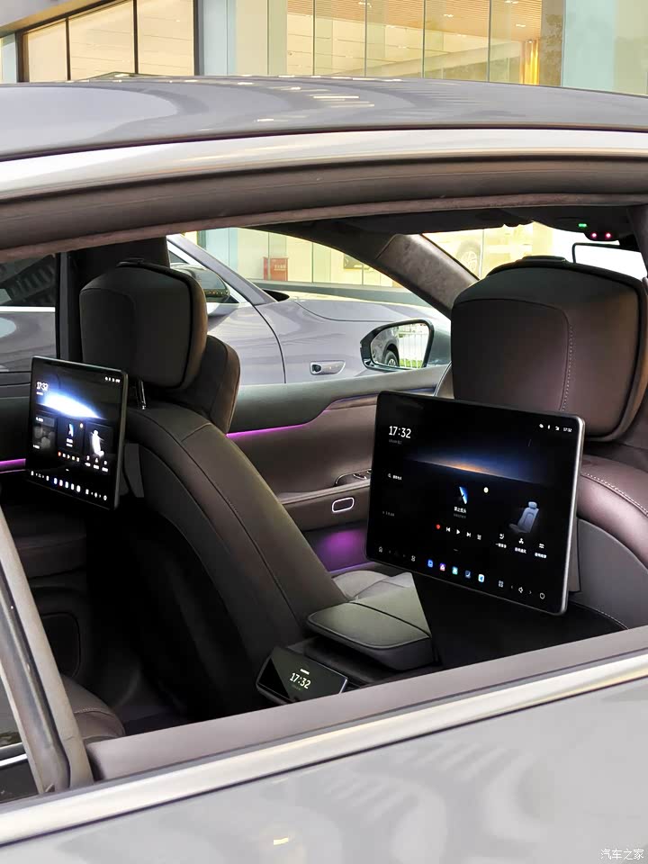 内饰的设计特别的豪华,而且非常的优雅,选择了棕色内饰,夜晚的时候是黑色的,但白天的时候会泛棕色,特别的优雅,加上多段式的氛围灯,整体的夜间氛围打造非常到位。后排的双屏幕,也给整个车辆的商务氛围增添了许多感觉。抬头显示也特别的大中控屏,竖屏的布置也合理,整体内饰布局非常的优雅。