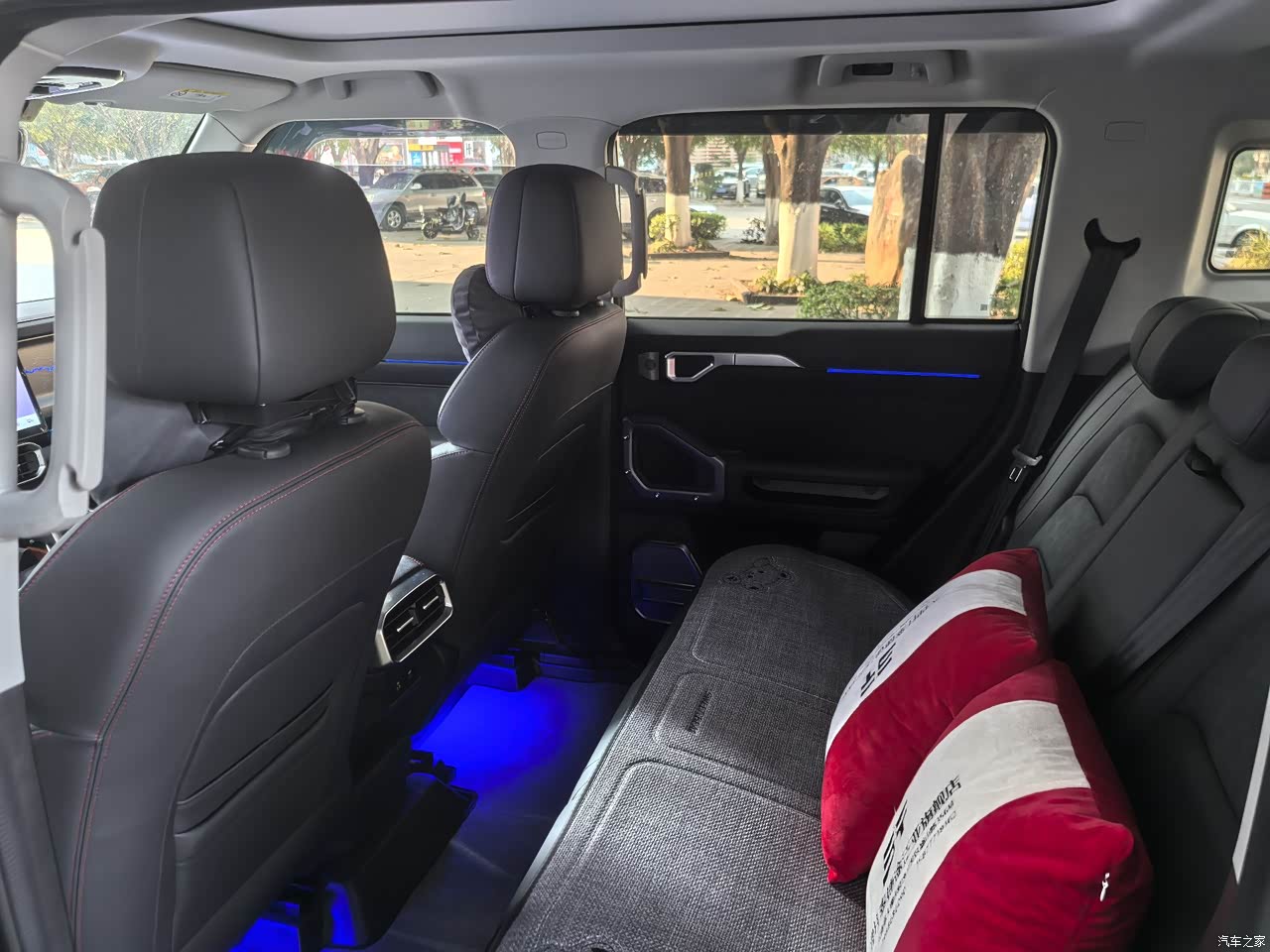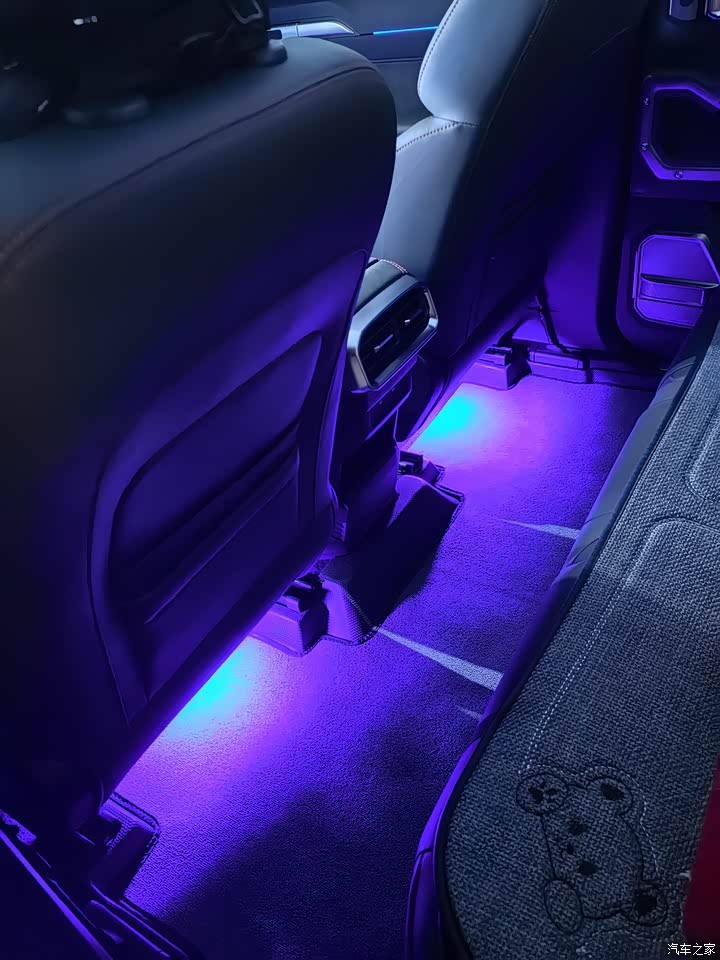 内部设计了很多的拉手,可以方便上下车以及越野路况乘坐时增加安全性。中控大屏科技感很强,座椅皮质手感柔软,主驾有电动调节和通风,全景天窗可以让你更好的欣赏到一路美景。原厂的318路线图是不带灯的,我自己换成了带灯的,显得立体感更强了,再自己加了脚下的氛围灯,晚上开车氛围感十足。空调制冷效果很好,在一排的座位下面还有两个给二排的出风口。
