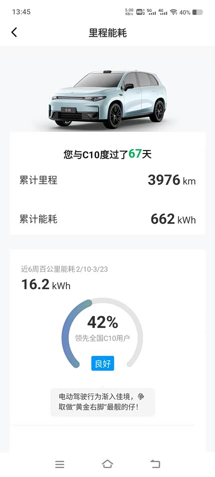 买车主要是家里领导开,最开始选车的时候,是想上一个六、七座插混,看了东风奕派008、零跑C16,奇瑞风云T9;说一下这几辆车的感受,东风奕派008好车价格实惠,最主要空间绝对六人够用,缺点这车内饰做工是真不敢恭维,加上媳妇试驾嫌太大放弃;零跑C16做工和细节到位,配置也高,但空间六座真是有点鸡肋;奇瑞风云T9好车各种都符合预期,底盘真扎实,奈何媳妇嫌它外观太丑,放弃了;蓝电E5 PLUS,确实便宜,和同事去试驾了一下,只能说这只是一个七座车,直接放弃了;后面朋友一句话点醒了我,六座用不到几次,插混对我来说不适用为了一年那未知的一两次出行,舍弃一年到头的便宜出行值当吗?我一想也是,媳妇每周两趟老家省城的跑,经常要跑个300公里左右,再远一年到头还不知道有机会没有呢!!最后就要纯电五座了,刚好去零跑问有一辆顶配现车,周五去的当天就定下了,周一办贷款,周二提车。C10用了67天整体还是很满意的,它在智能化硬件上真的拉满,8295芯片和激光雷达,还有很符合主流的中控布局,一下子就满足了我对科技产品的期待。