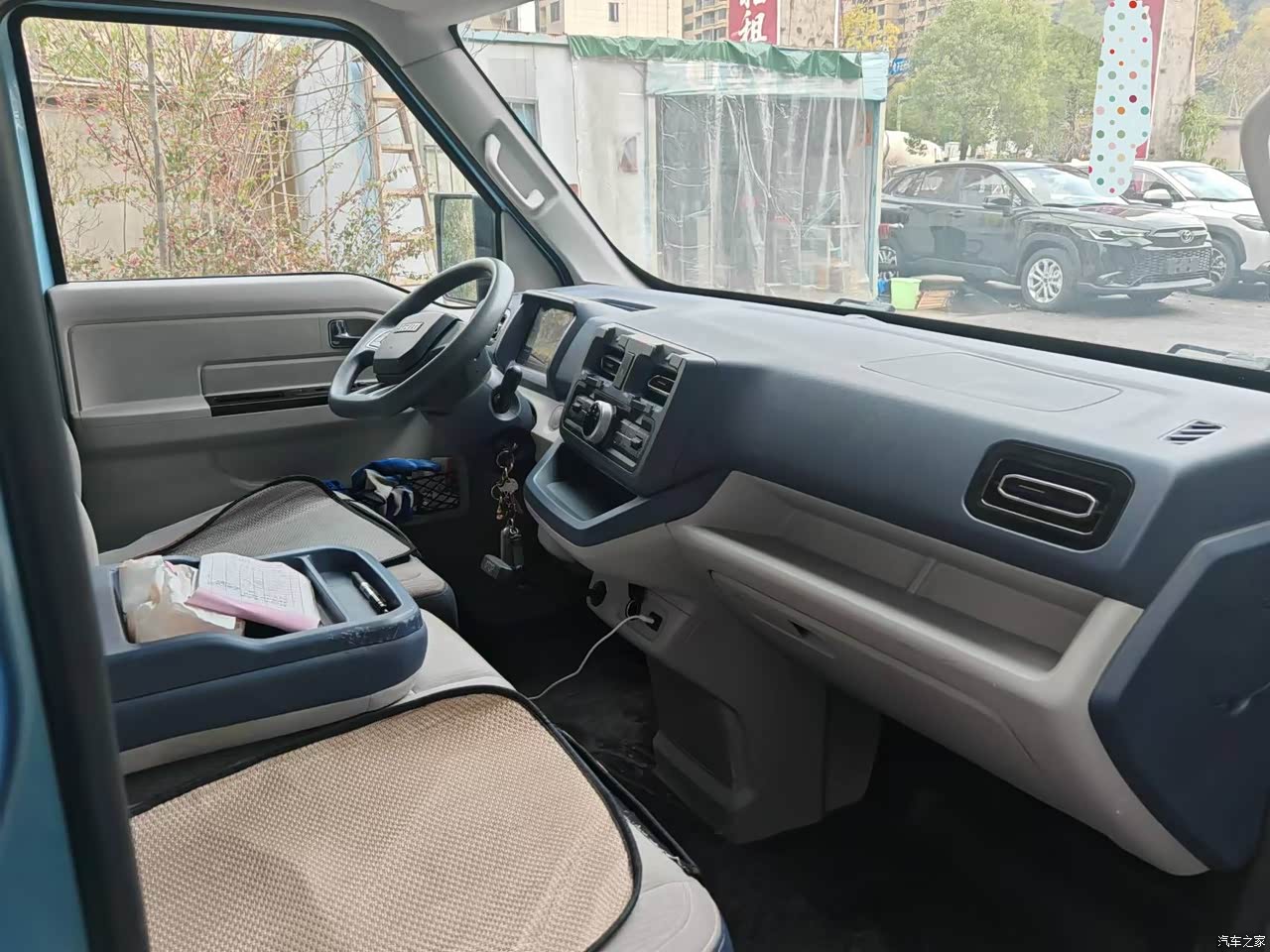 前后是隔开的,前面驾驶室很宽敞的,座椅是贯穿式的可以容下三个人还有空间。