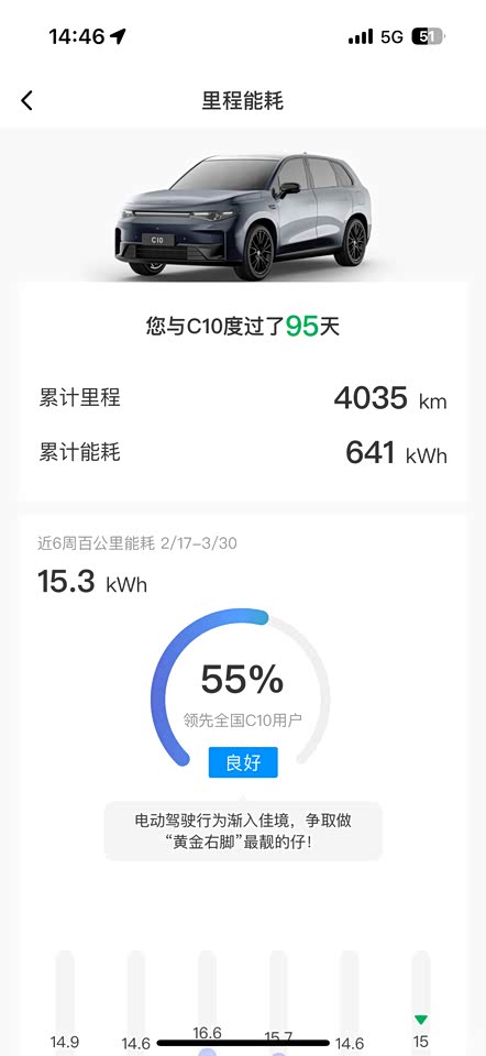 续航方面确实有点不尽人意,有可能是我脚法不太行!我有家冲,大部分都是根据app的健康充电冲到90%,然后动态续航显示只有437,如果充满也是没达到530的,市区内开(空调啥的都开)九折不在话下,但是上了高速路,上了120掉电就有点厉害,最后跑出个65折,虽然续航方面不是很理想,但总体上来说够用了,没有完美的事物,作为车主还是很喜欢零跑这车的!
