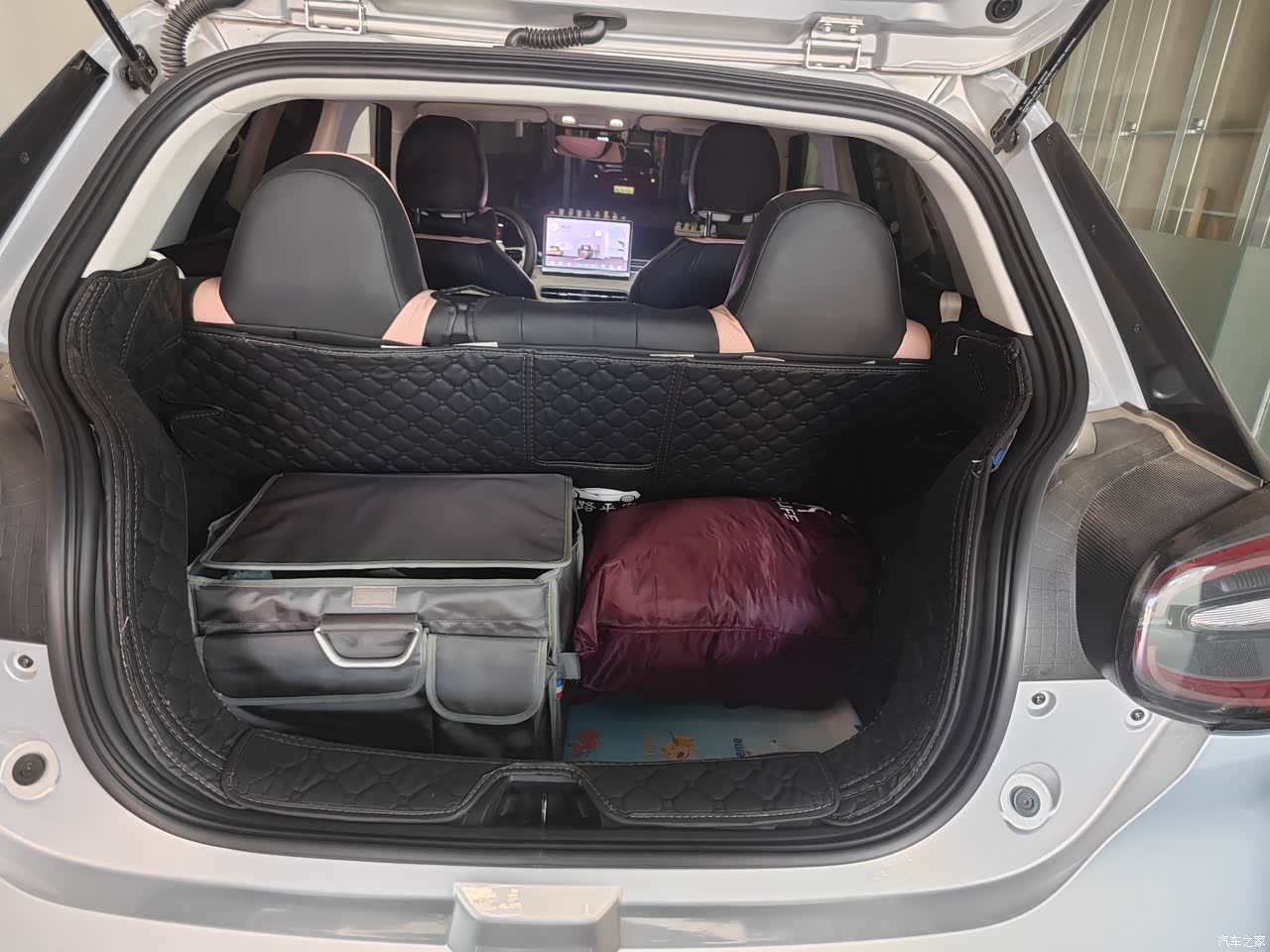 空间利用的很合理,后排坐3个人不拥挤,女士放 的东西很多,这个收纳东西的地方还不错,包包 零食什么的都有地方放!