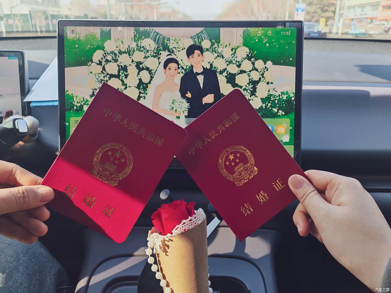 提车60天已经行驶2500公里啦 图一是全城大堵车而我和老公在车里K歌 图二领证那天为了拍照好看 特意把屏保换成了用AI生成的婚纱照 图三两个车第一次的合影 图四是我的小电电个车写真!太帅啦