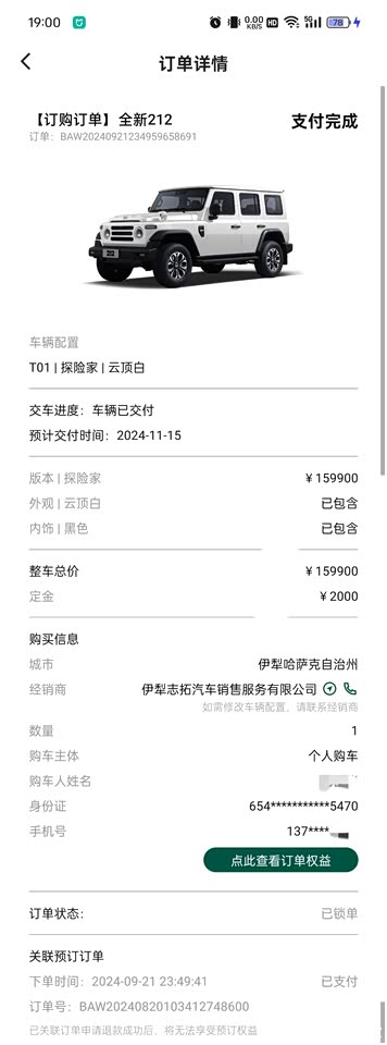 2024年8月,没有任何越野经验的我开着朋友的300穿越了位于伊宁市和赛里木湖之间的牧道,这次穿越全过程让我的肾上腺素暴增,此次经历也让我彻底爱上了越野这项活动。 其实在2020年冬天,记得还是第一次疫情后,伊宁市到了一批坦克300,我迫不及待的完成了试驾(三次😁😁,后面实在不好意思再去了😂😂),感受非常乃意思,无奈价格超出了预算,一直没有下决心购买。2022年的冬天,我又试驾了汽油的牧游侠七座,感受也同样乃意思,可是碍于价格,我还是放弃了。 一直关注之家的我在2024年7月得知全新212即将上市,212硬朗的外观深深的吸引了我,厂家宣传的盲订用户各项福利更加让我心里痒痒,果断在8月提交了盲定金1212元。当试驾车到来后,我依旧是迫不及待的狂嗨皮两次,强大的越野通过能力、良好的操控性、狂躁的发动机、平顺的八速箱让我记忆深刻。时间很快来到了九月,全新212公布了售卖价格,13.99万元的起售价加上盲订转大定的各种福利,让我无法抗拒,选择了中配,果断提交了2000元的定金。 之后就是漫长的等车时间,期间打电话给400、跑4S店,我也记不得多少次了。2024年12月22日,心心念念的212终于到了,赶巧踩上置换补贴政策的尾巴,24日付了159900-6000+5000+13000=171900元,我把心仪的大玩具开回了家。 拿到手的大玩具,那自然不能摆那儿看着,雪山、河道,总之哪里难走就去哪里。四个多月过去了,212没有让我失望,无论是过河、泥泞、陡坡、深沟、冰川,都能从容不迫,这也吸引了身边一起玩越野的小伙伴的关注:诱人的价位、漂亮的外观、强悍的性能,是问有几个男人能抗拒? 提车后,我积极参加了厂家搞的圆梦金活动,也非常有幸获得了1W圆梦金,再加上置换补贴1.3W,大家算算我的中配大玩具落地价格是多少? 还有,盲订客户有价值5000元的选装基金,我可以选装前锁或者防空灯和电踏,但在转大定时候觉得这些都没必要,这笔钱就没用。在交车后,也就是2025年1月16日,厂家把这笔钱折成了同等价值的积分500000给了我,我用其中的400000积分兑换了四条商场里的AT轮胎,哈哈,刚好赶上冬季过去,我不用再买AT轮胎了。 自己喷的白色漆,好看嘛?