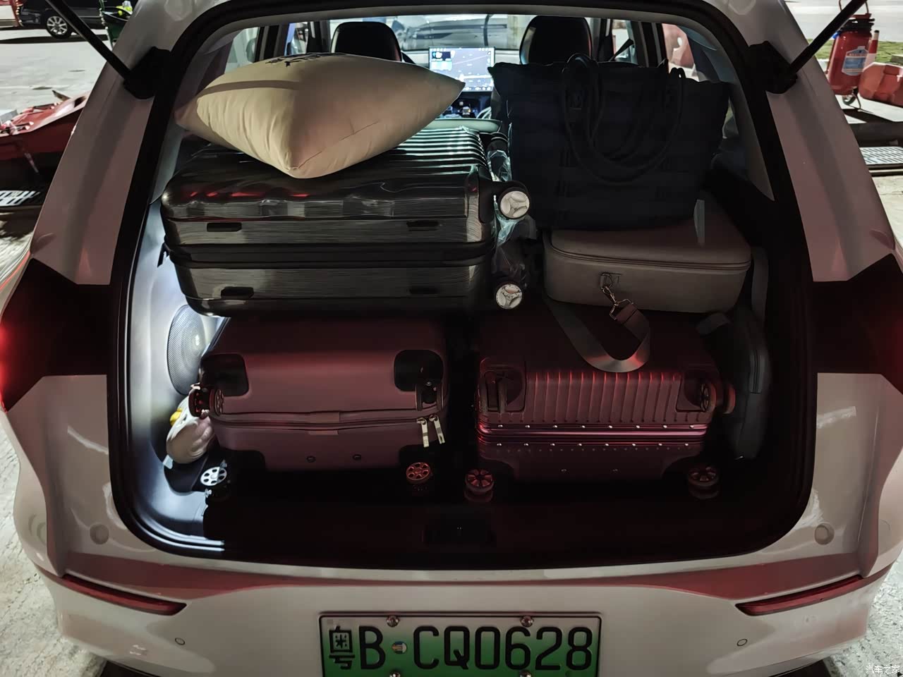 看图就知道了,即便后排角度不需要往前调的情况下,三个行李箱都绰绰有余,而且底下下沉空间还能放很多东西,后备箱无敌满意。