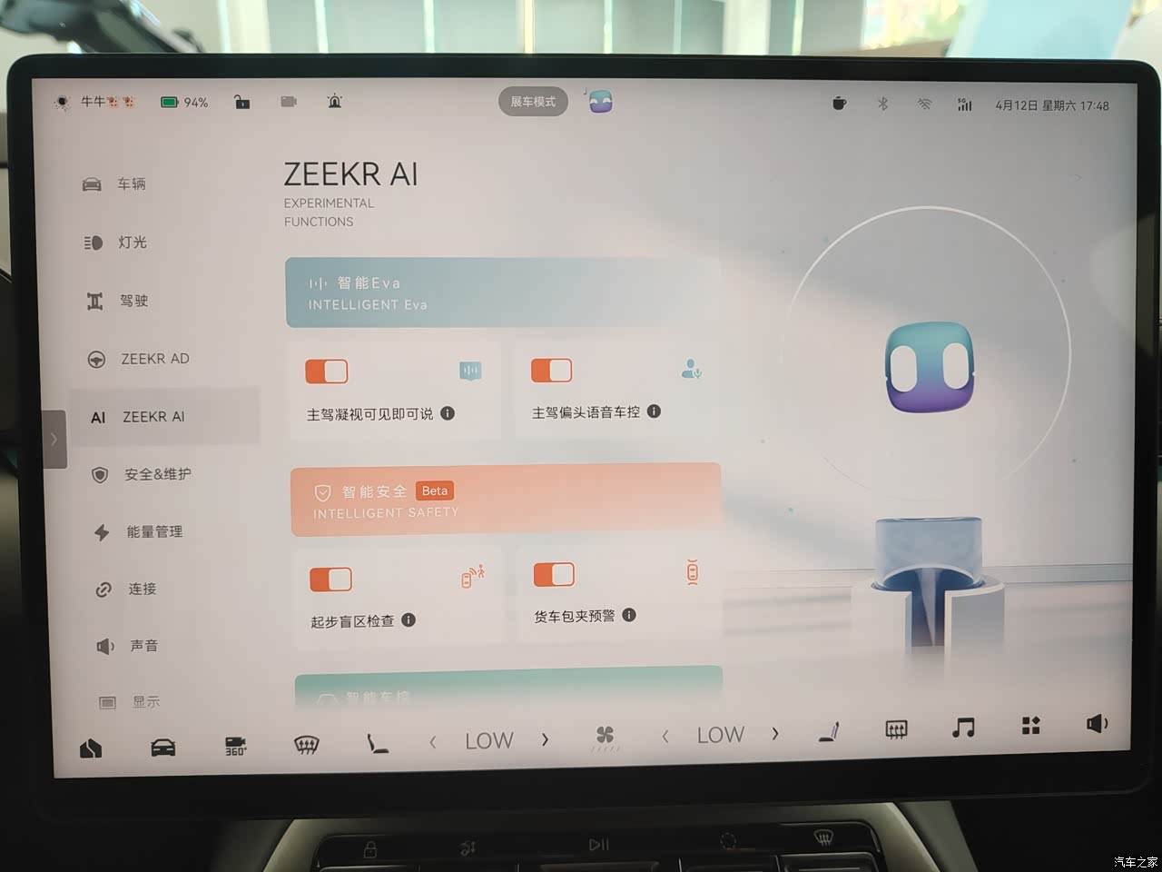 整车的智能化配置丰富,车机系统反应速度很快,语音交互功能很强大,配备了540度全景影像,HUD抬头显示等,这点我必须先说下,极氪007GT的HUD抬显非常清晰,而且是我见过的豪车里最大屏幕的,抬显在实际开车中还是很实用的,不用低头看屏幕,安全性好。而且极氪的细节做的很好,一键开启各个模式,洗车模式,露营模式,宠物模式等,很好的体验。 整车配备了高清激光雷达,销售顾问说测距可以达到300米,这个距离已经相当好了,这样智驾的过程中,能非常好的观测到较远的情况,提高智驾过程中的安全性。 极氪007GT配备了高清无图领航智驾,代客泊车等功能,而且因为母公司是吉利,安全性非常棒,这点尤为关注智驾得有,但智驾的安全性需要更好的提现,大家从我拍的照片中也可以看到极氪007GT的安全性措施很全面。