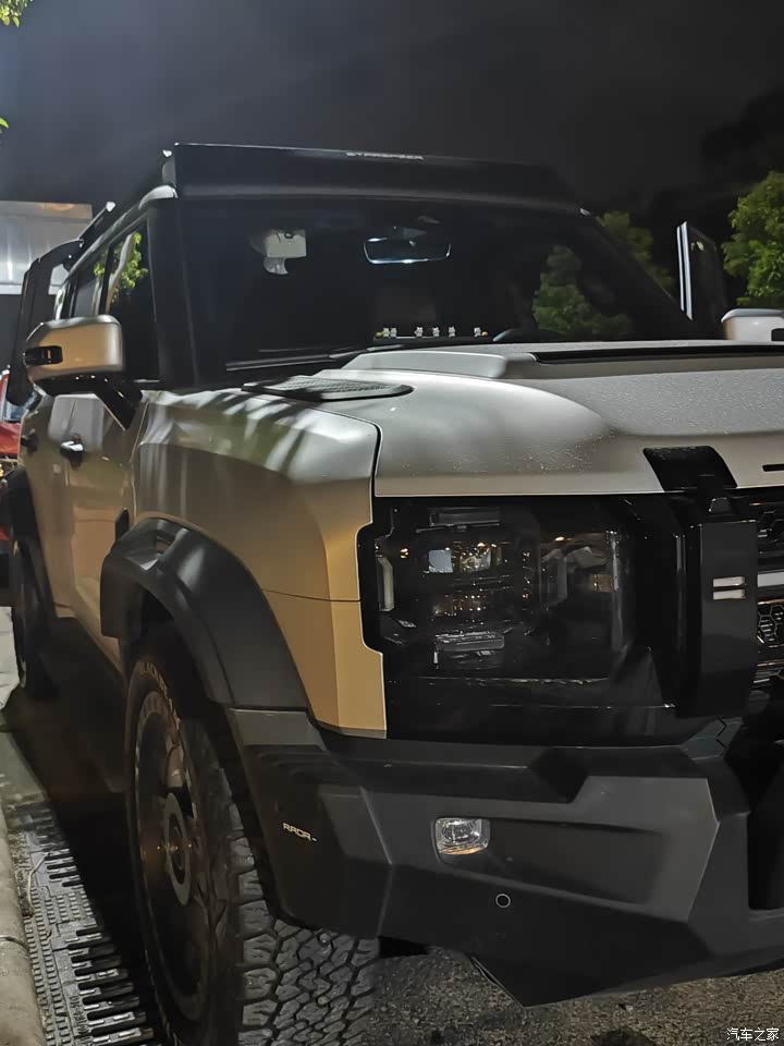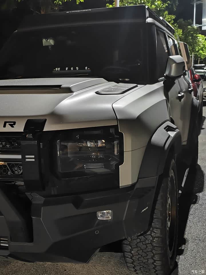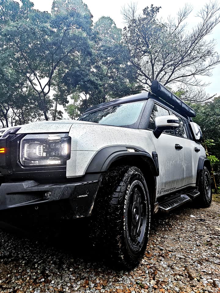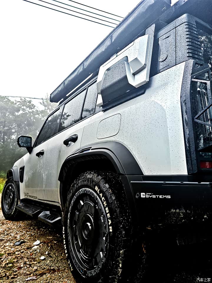 车身采用80%的高强度钢,硬度和安全性杠杠的,外扩轮眉将车身宽度参数加大到两米开外,配合负值防脱轮毂和全地形轮胎,以及前后竞技杠显得特别硬朗!