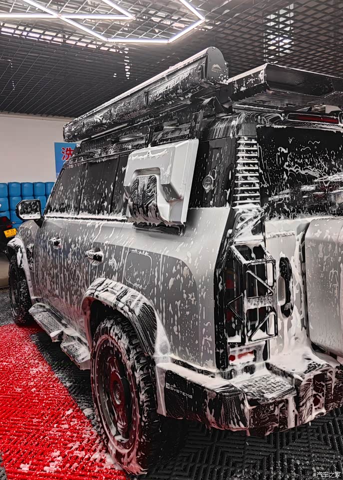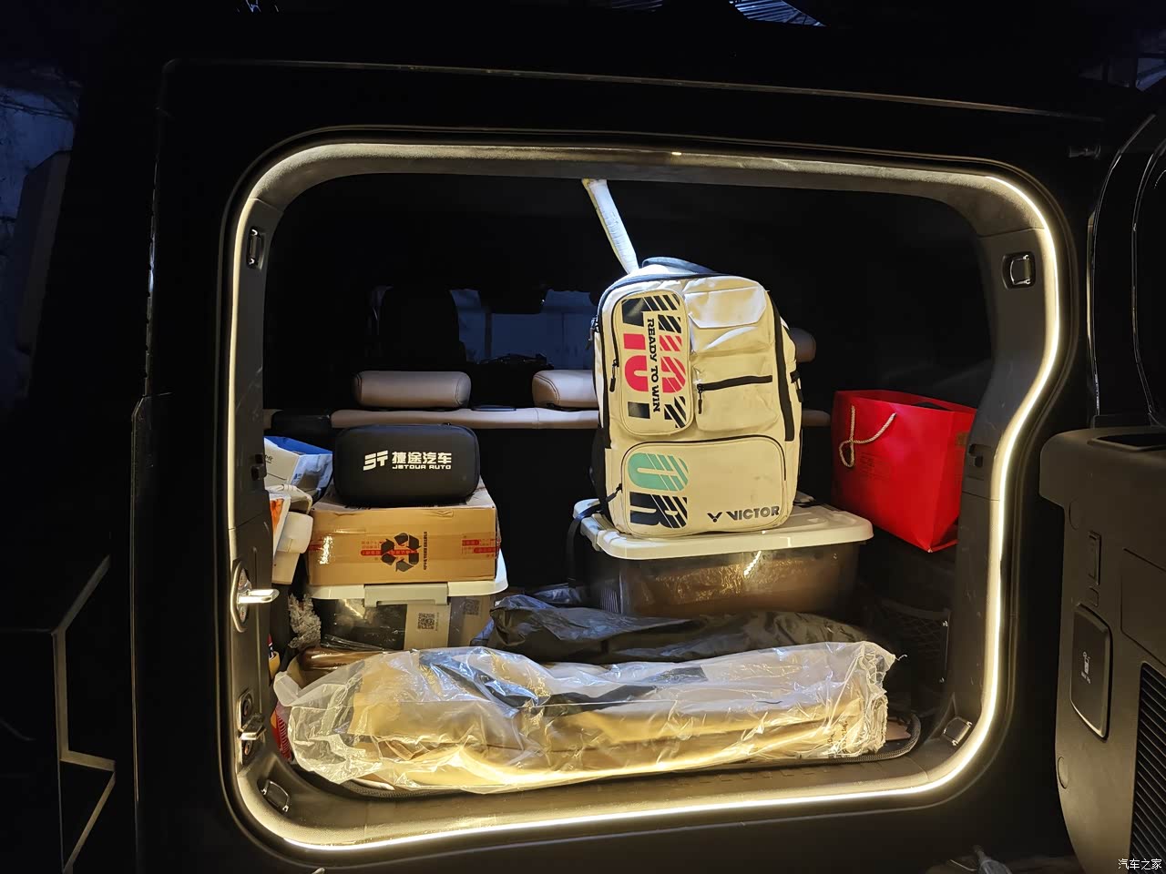 常规状态下,后备箱容积足够放下4-5个20寸行李箱,后排座椅支持4/6比例放倒,纯平后最大纵深可达1.8米,临时当床车没问题。如果觉得不够,还能通过外挂储物箱、车顶平台扩容,比如车顶可固定大件行李,尾部外挂箱专门放工具或备用油桶,彻底解决户外装备多的痛点。
