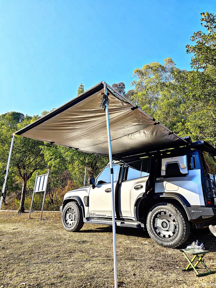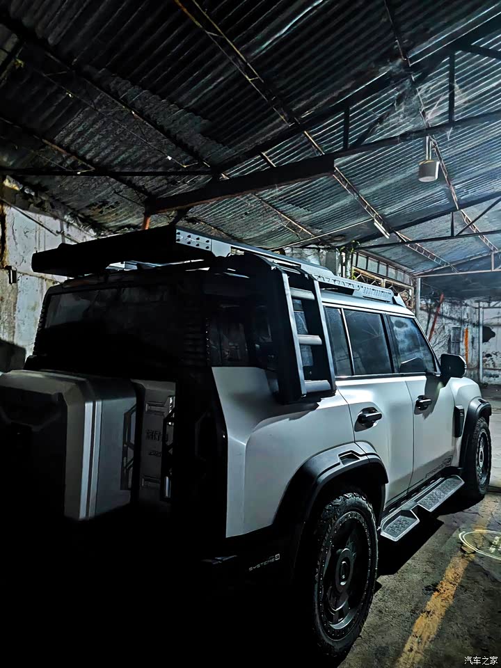 最突出的特点是「可玩性」——全车设计了40+拓展接口和榫卯结构,能自由加装车顶帐篷、侧边天幕、行李架等装备。比如车顶的多功能平台可以直接固定行李箱、脱困板,甚至安装两段式舷梯上下车顶,露营时秒变观景台。尾部还有外挂式储物箱和定制侧书包,方便存放工具或备用轮胎,彻底释放车内空间。
