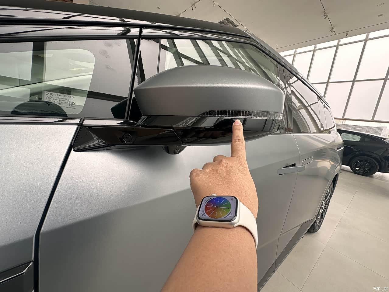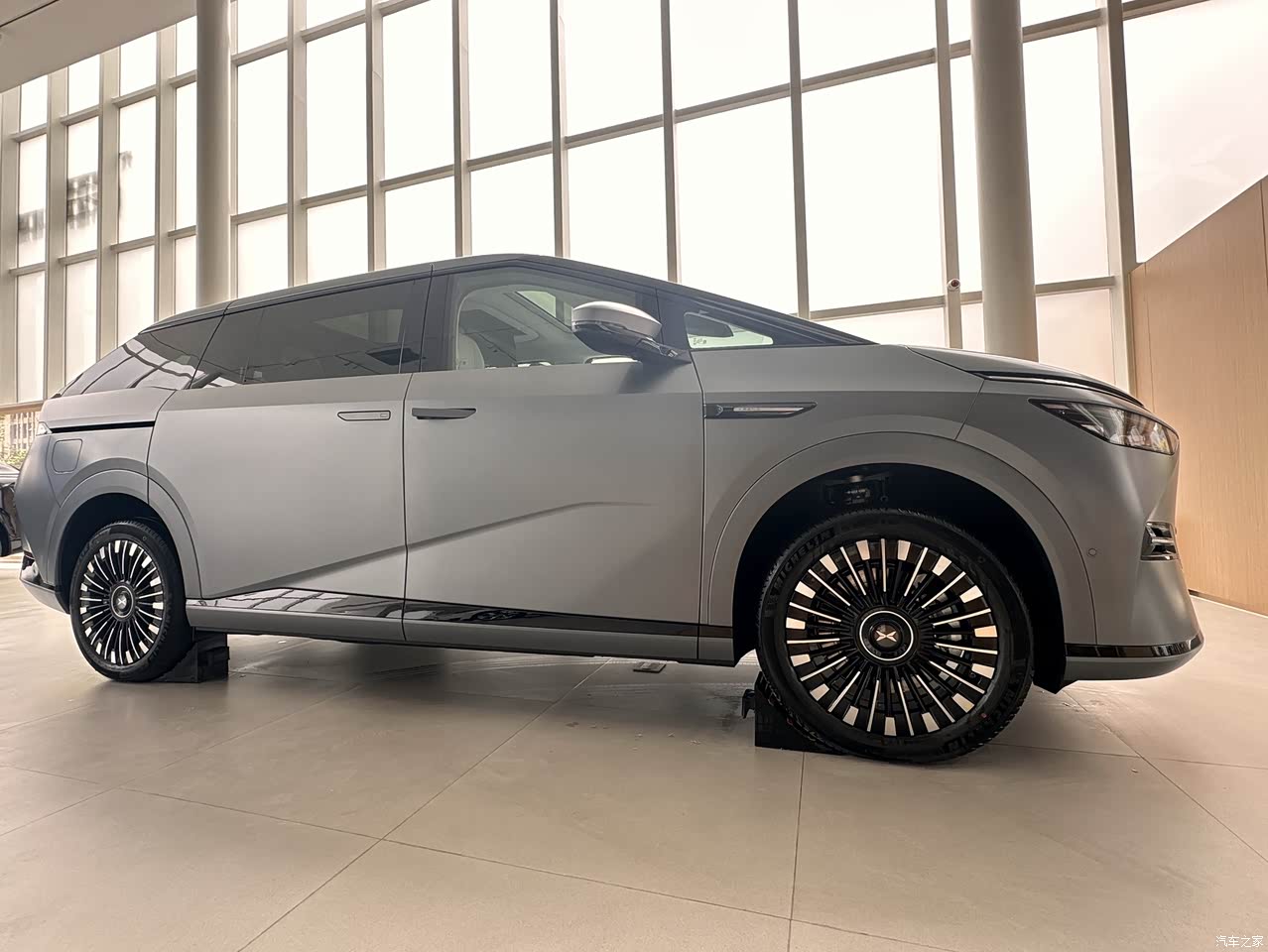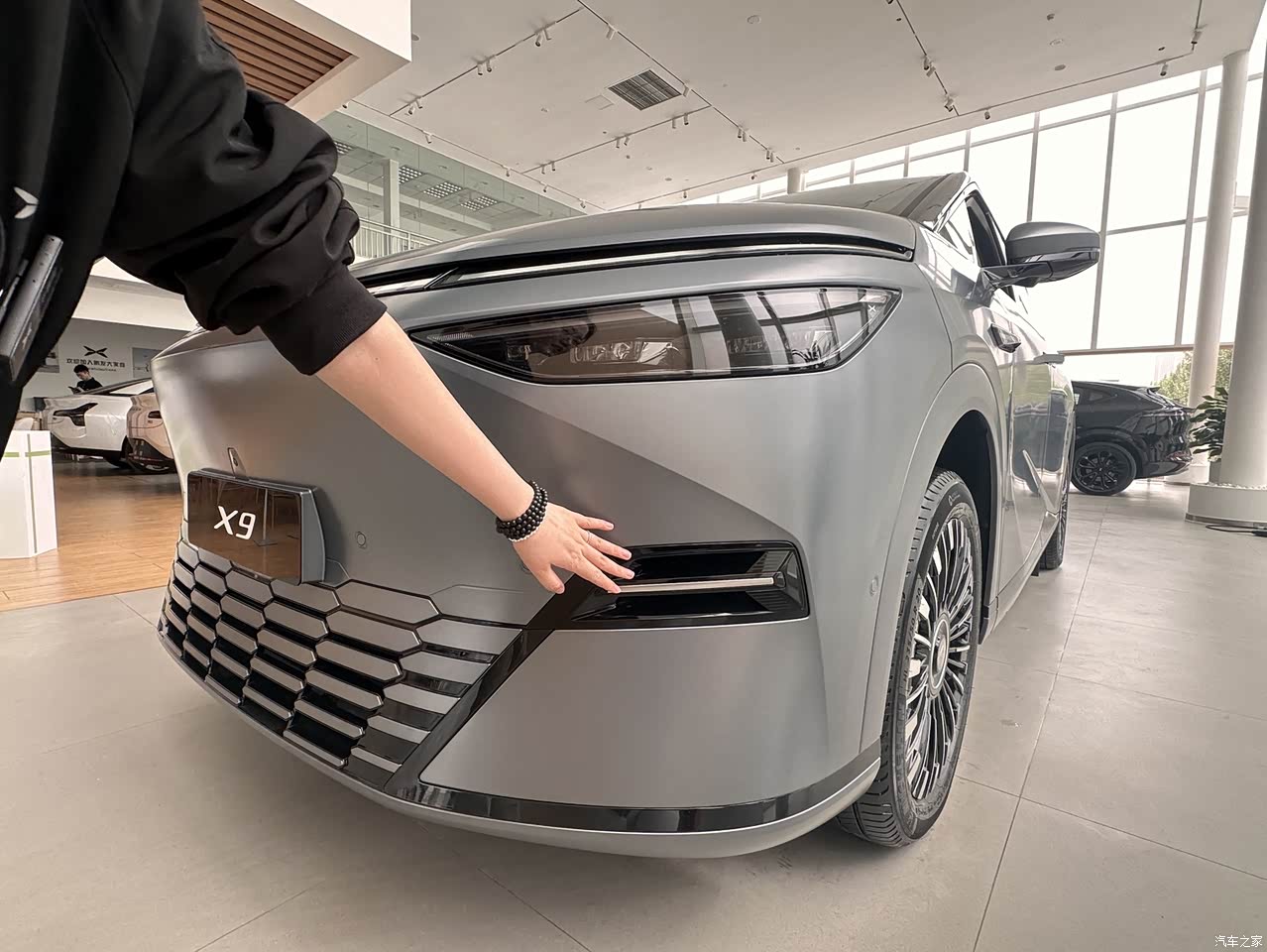 外观上新款x9和之前变化不大,在我看来,主要有4个点变化比较大。 第一,颜色,新款全新升级 3 款车色:星舰灰、星云紫、星系蓝,我体验的就是星舰会,感觉看起来很大气。 第二,轮毂,20英寸星耀悬浮轮毂(新款的轮毂感觉更高级更好看)。 第三,后视镜,现在是AI智驾小蓝灯(和想子一样,现在小鹏也加上了智驾的小蓝灯,智驾时会亮起,给周围车辆提示)。 第四,前脸灯,X-Robot家族式前脸(新款采用了纯视觉智驾方案,原先前包围两侧的激光雷达被装饰板替换了) 其他都和之前差不多。