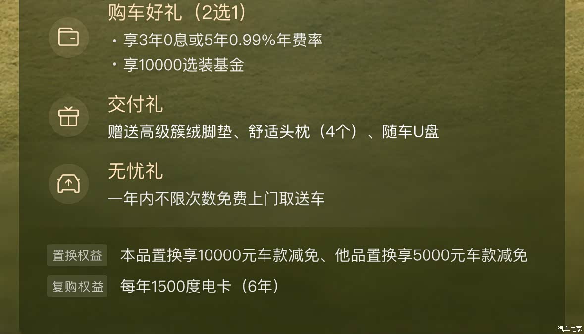 3年0息,这个政策不错。本品置换,少1万,其他车少5000。复购的话有6年免费点卡,一年1500度。算下来相当于9000块。