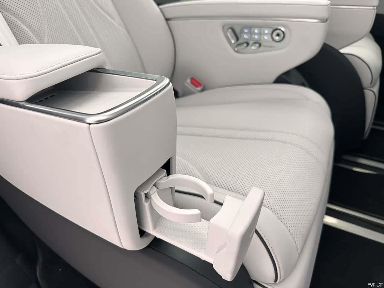 内饰相比之前可以说全面精致升舱,全舱26.6平方米的柔软皮质包覆。 官方内饰颜色,有3种,气宇灰,月影咖,深空灰; 我体验下来有3个地方变化比较大,1,前排无限充电那里,现在是高级麂皮质感无线充电面板,摸着更舒服。2,按键、饰板材质有进行升级(现在是PVD真空镀膜工艺,看起来有金属光泽,而且耐脏,容易清洁)。3,冰箱,之前是塑料的,现在用的是高级皮质(包覆电动冰箱),看起来更高级。当然都是双温冰箱,温度在0-50度都可以调节,夏天吃冰棍,冬天喝奶茶,都能实现哈哈。 对啦,现在,主副驾的门,都升级成电吸门啦,轻轻一关就可以。 副驾也有座椅按摩通风加热啦。 第2排的座椅除了零重力外,还有杯架,无限快充,不错。