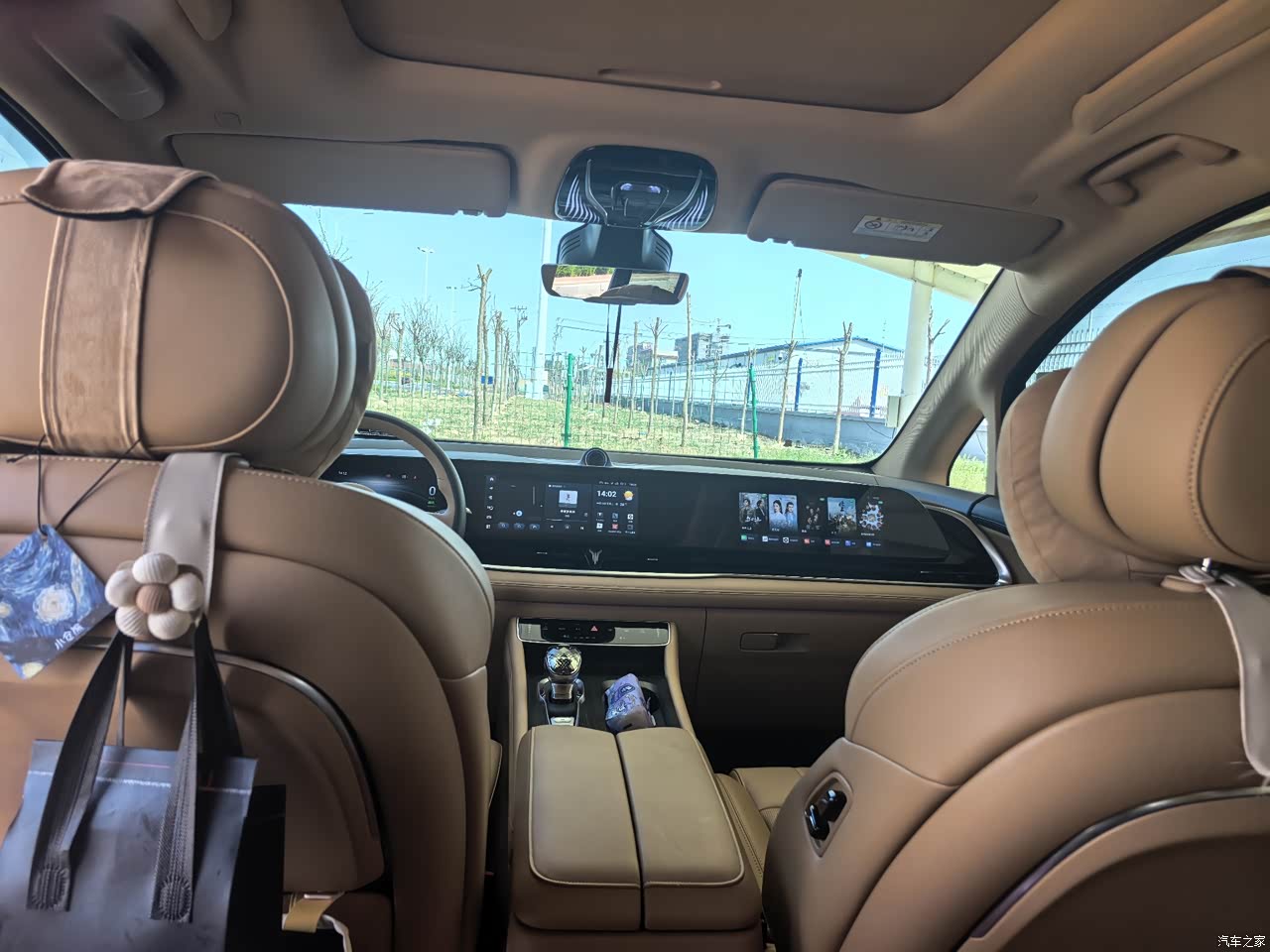 内饰颜色我选择的骆驼棕,坐进去第一感觉就是挺高级的,皮座椅软乎乎的,中控台摸起来也细腻,没啥塑料感。前排三个大屏幕连在一起,像家里的大平板,操作起来挺跟手,还能语音控制空调、导航(喊一声“嗨岚图”就行)。不过有时候会识别不到。