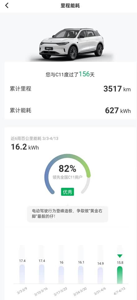 提车的时候正好是冬季,开热空调的续航确实比较吓人,最近温度上来就好了很多,我的通勤路段超级拥堵且近,粗略算了下1度电差不多行驶5公里,距离越远能耗越低。温度上来后记录到最低的一次能耗。