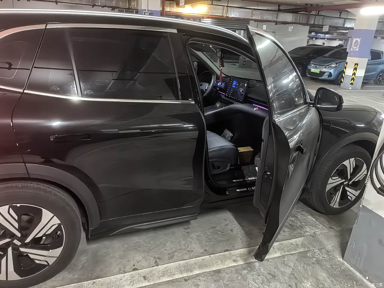 我选的黑色外观,耐看大气。 - 前脸设计:采用光之涟漪·律动格栅,封闭式格栅造型,能有效优化风阻系数。两侧大灯组造型犀利。 - 车身侧面:运用了隐藏式门把手和低风阻轮圈设计,不仅提升了美观度。车身采用经典的双腰线造型,上半部分腰线较为圆润,下半部分则有一个C字形线条勾勒,线条流畅且充满动感,轮拱上方的线条还能在车身表面形成丰富的光影效果。 - 车尾部分:采用了贯穿式LED尾灯设计,灯组内部光源由多根LED灯带组成,造型大气,点亮后视觉冲击力强。